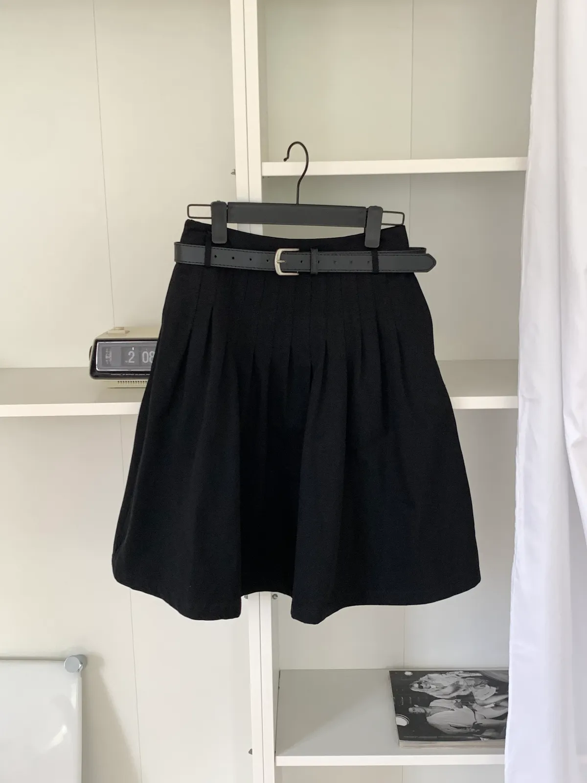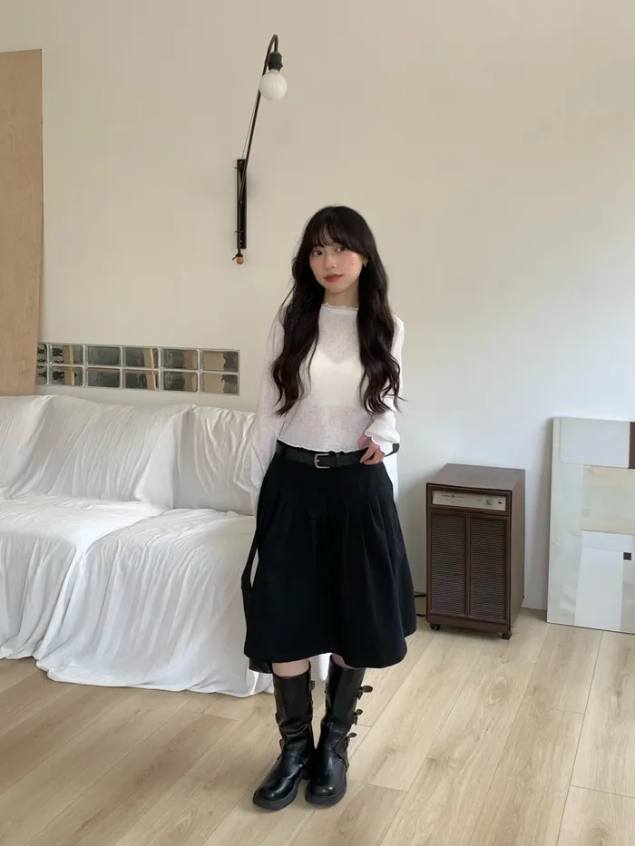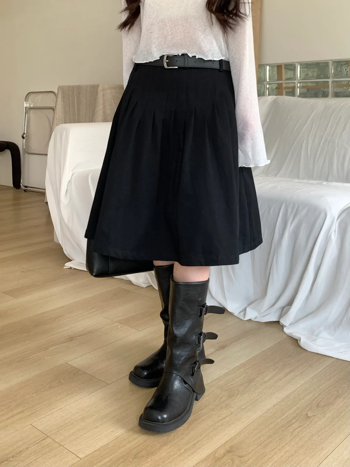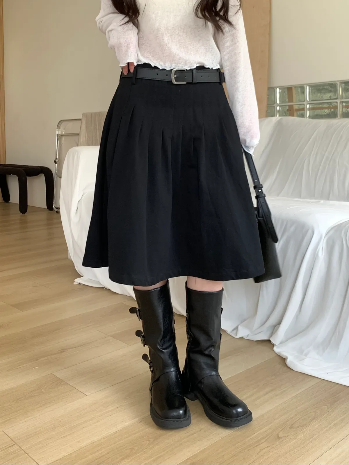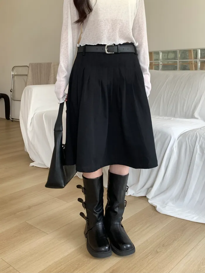 Mar.首爾漫步清冷感壓摺中長裙,附皮帶(2colors)