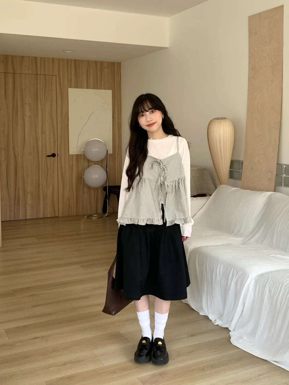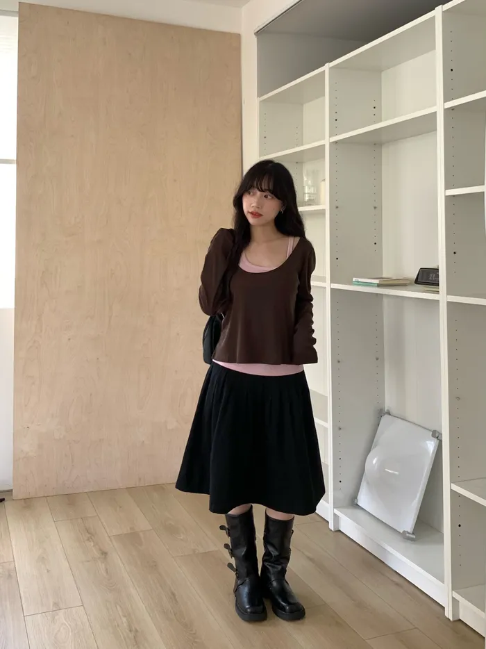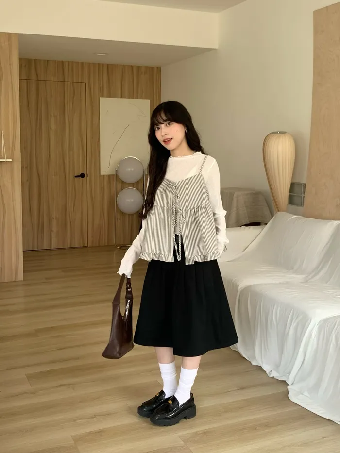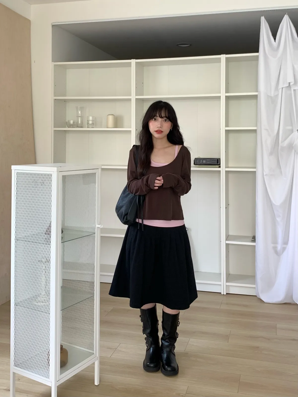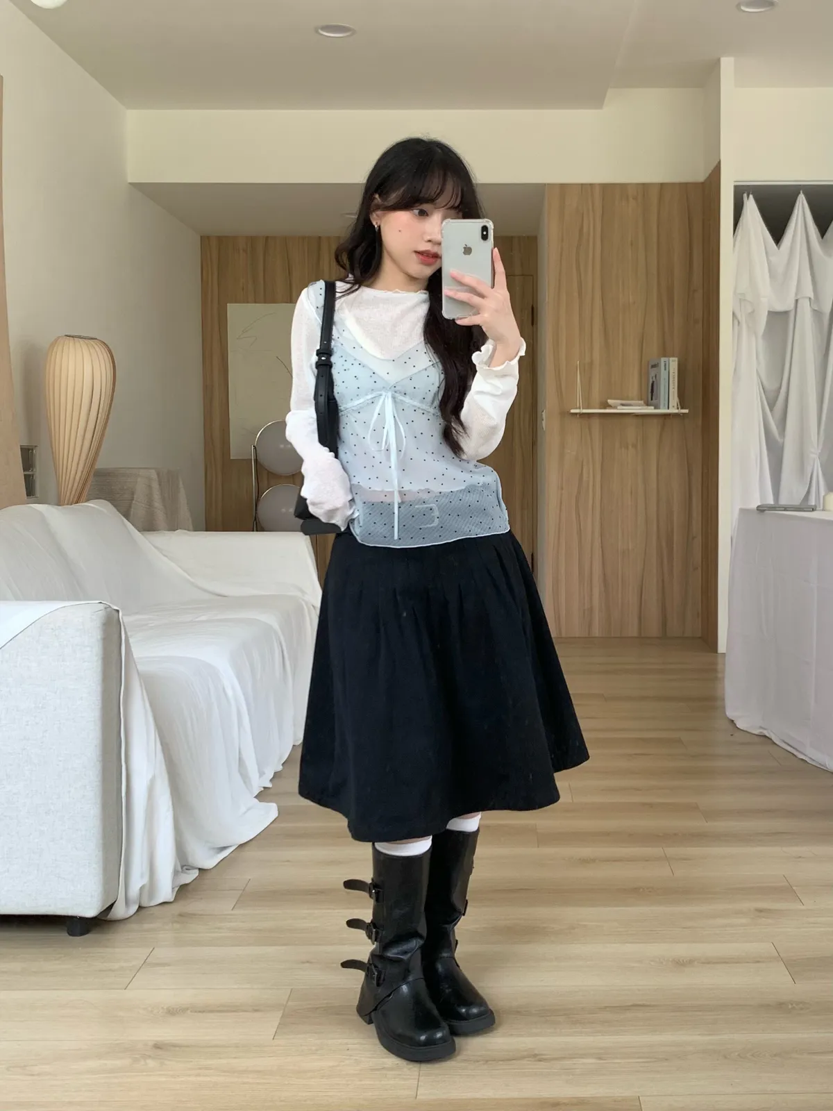 Mar.首爾漫步清冷感壓摺中長裙,附皮帶(2colors)
