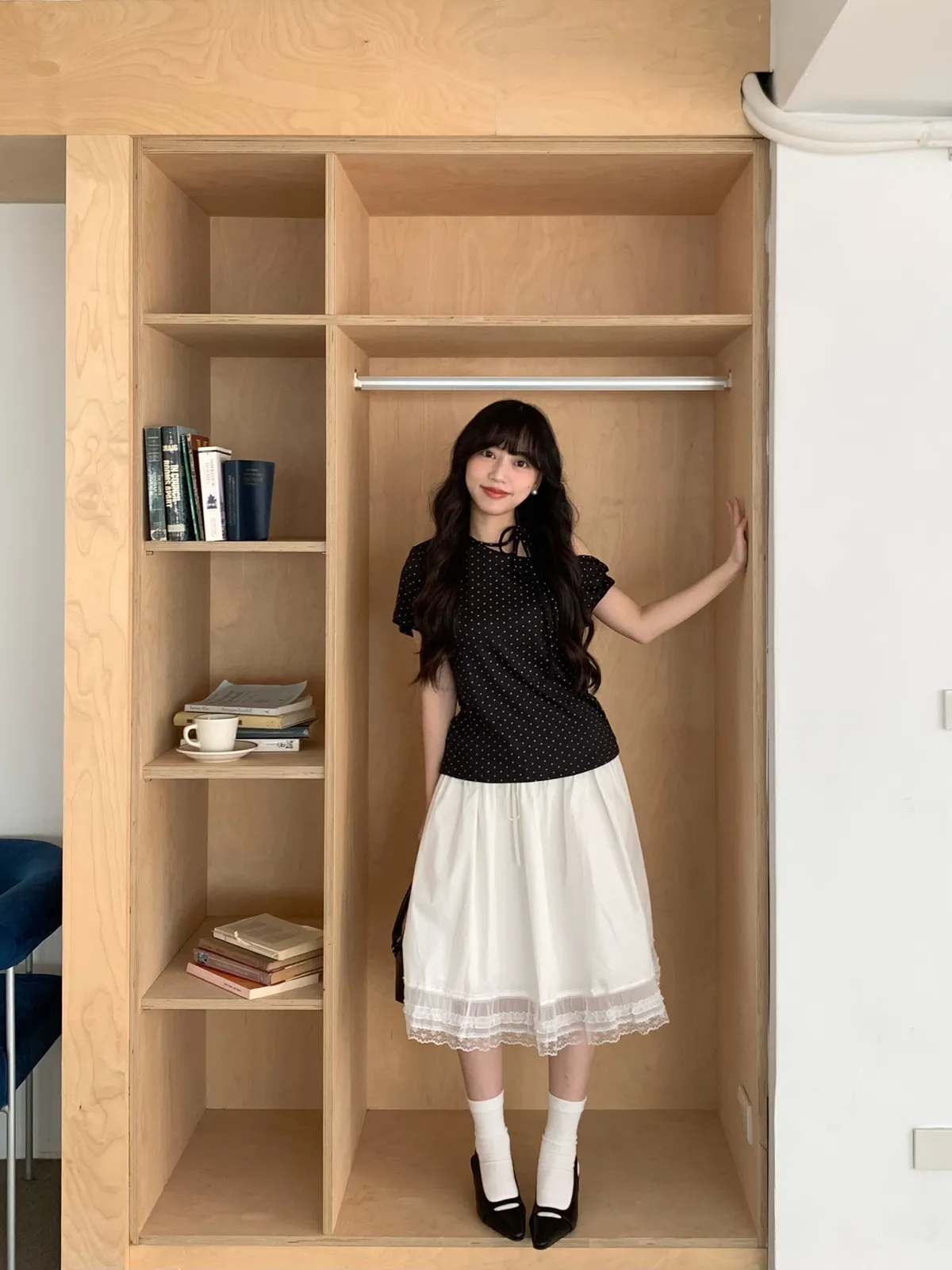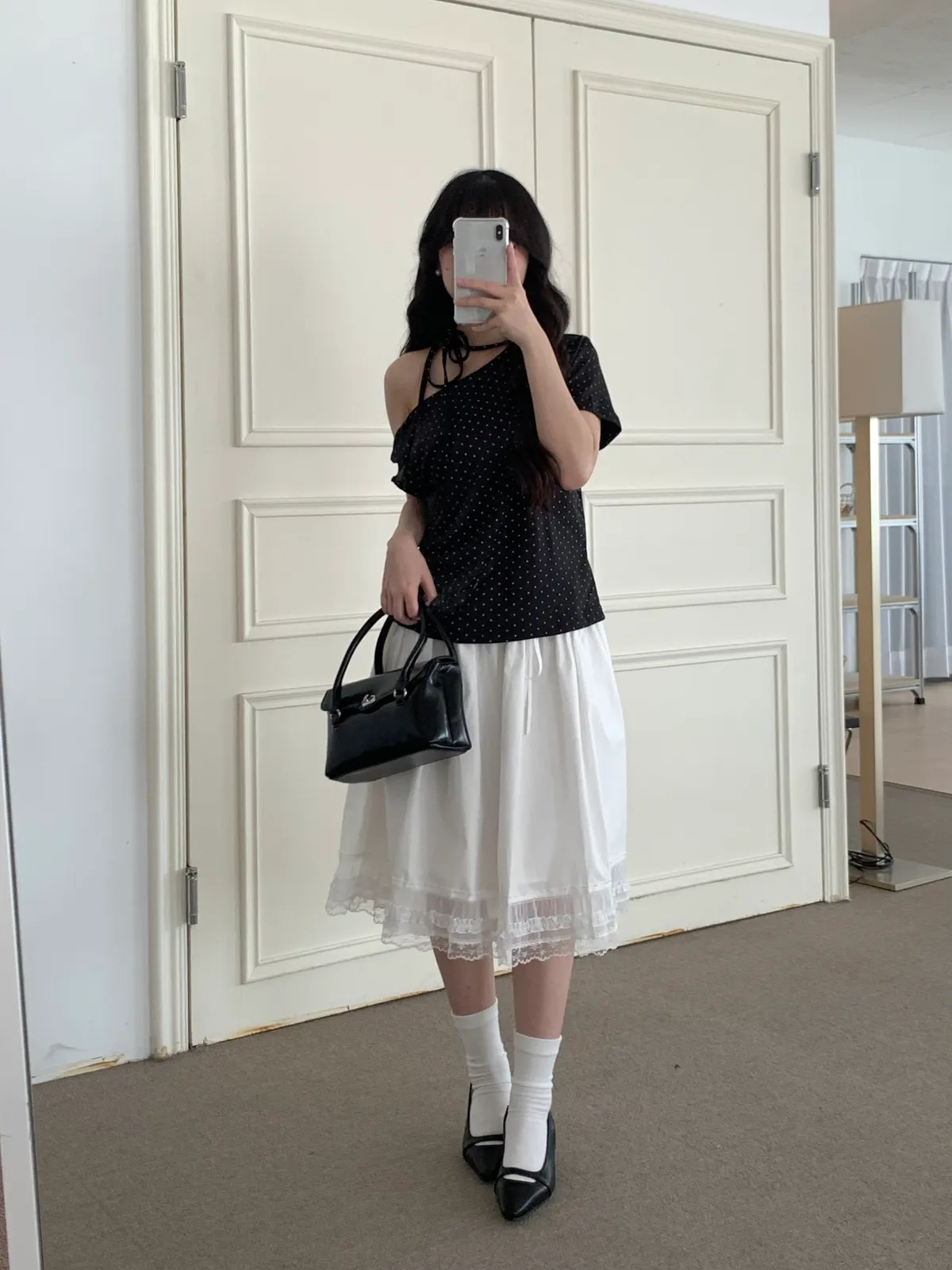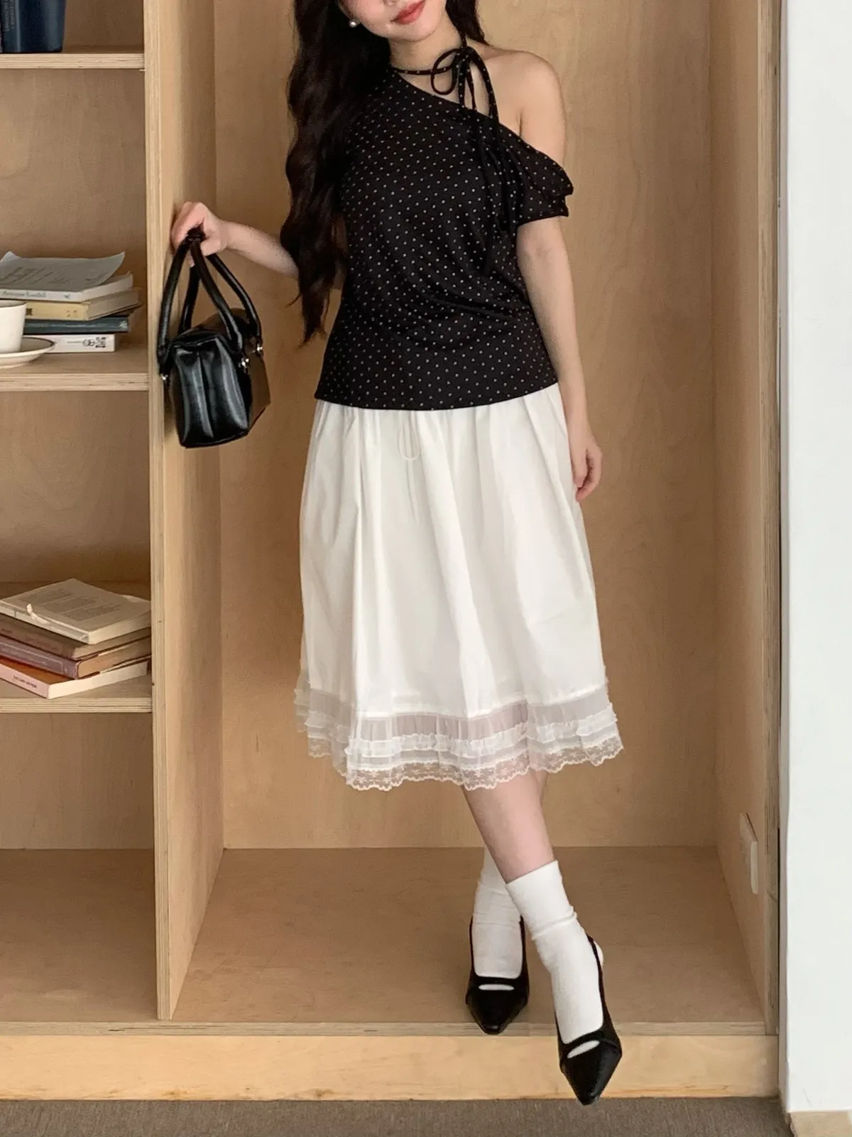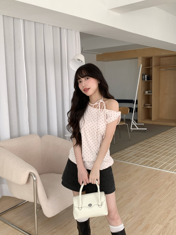 Apr.Blush Dot微醺波點斜肩綁帶上衣(3colors)