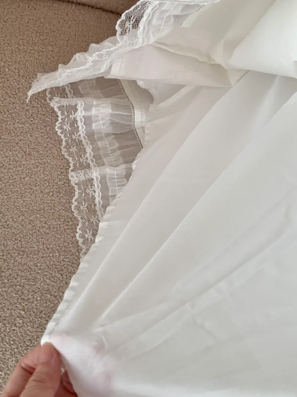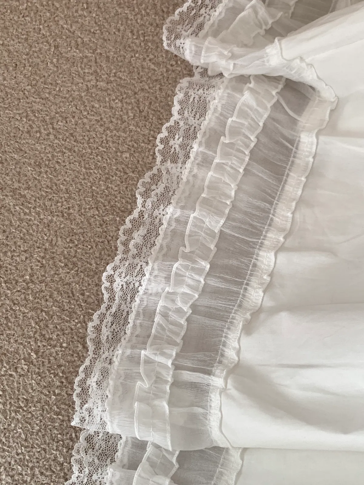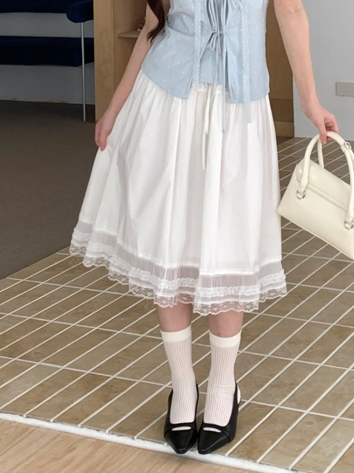 下擺是做拼接雪紡紗及蕾絲的材質設計,讓整件白裙更有仙氣的意境🧚♀️