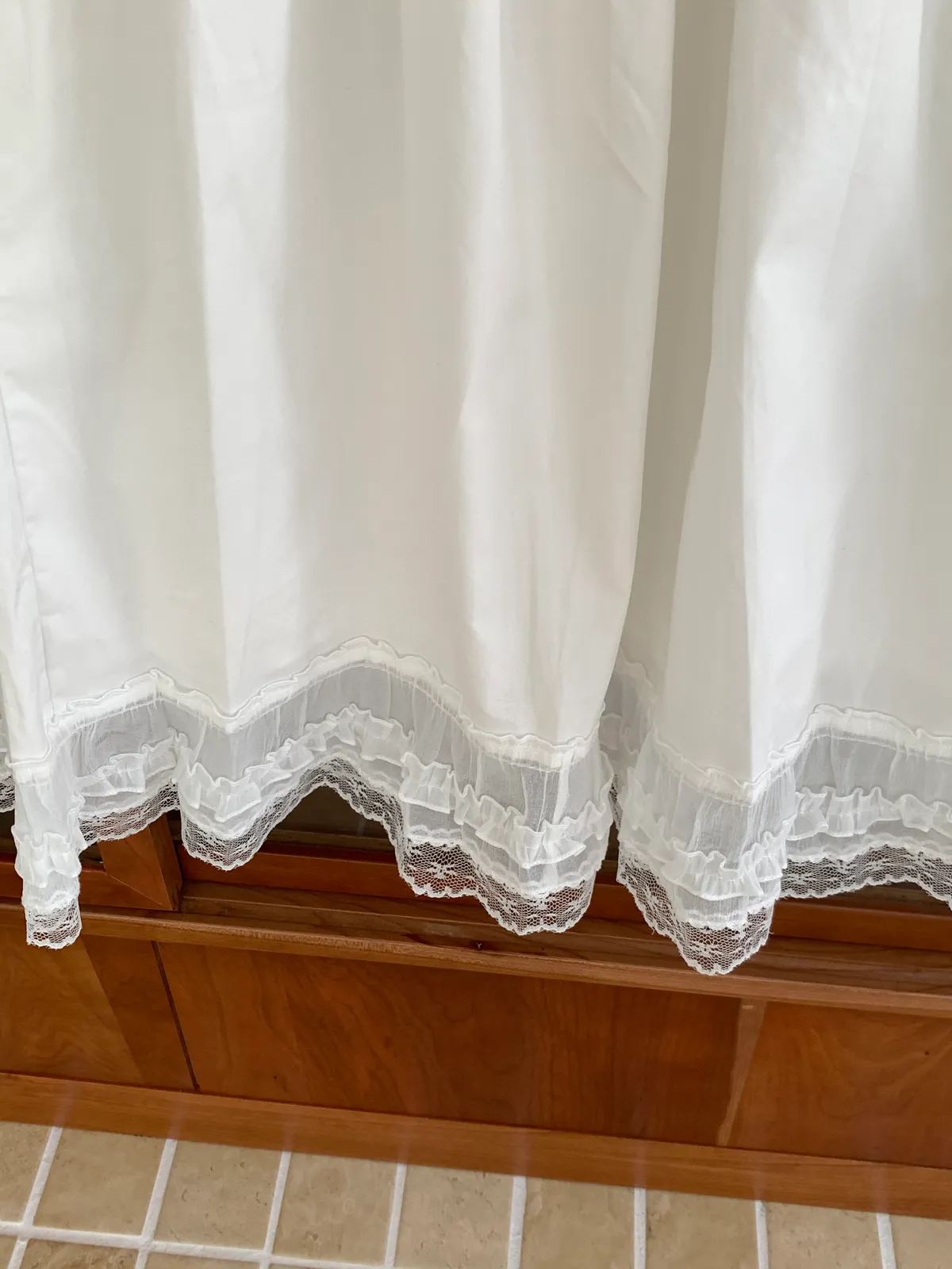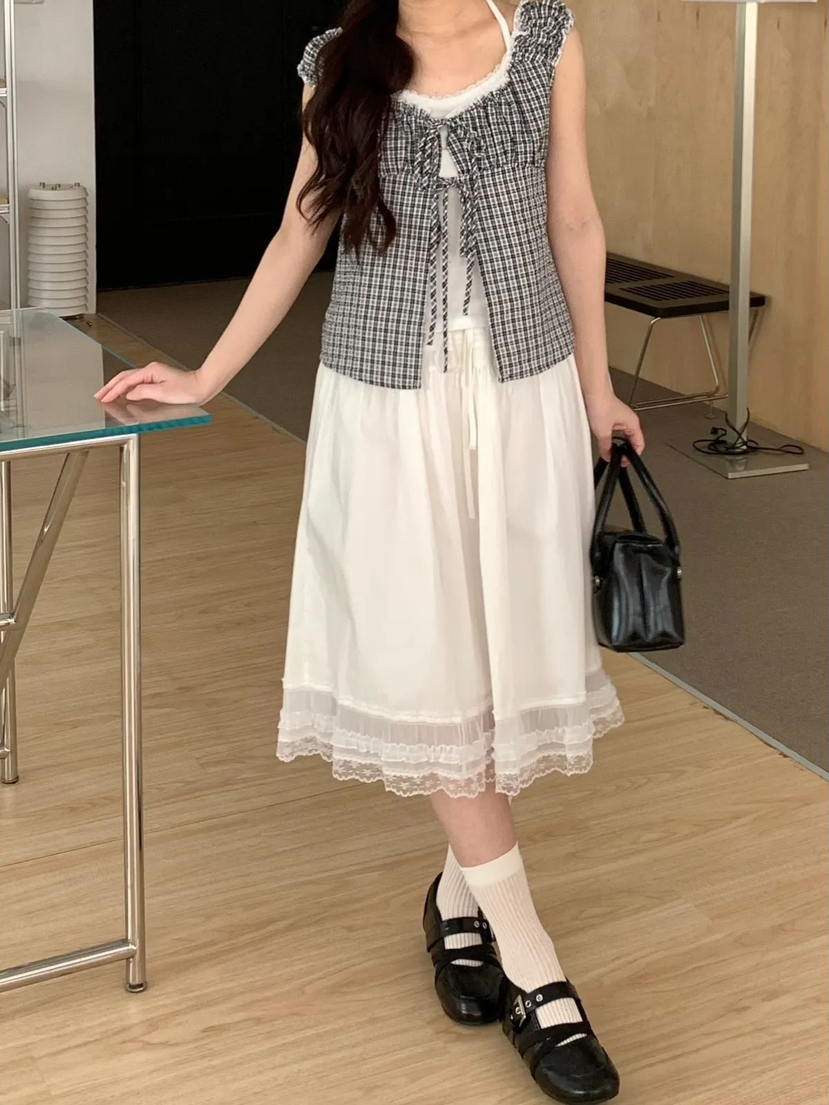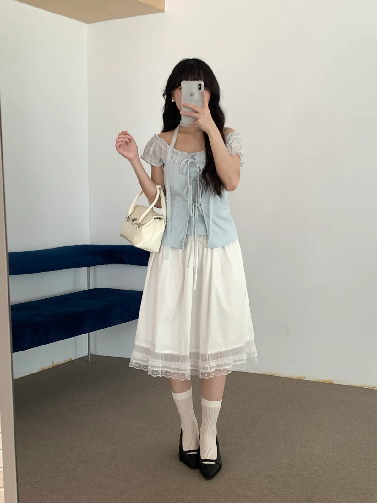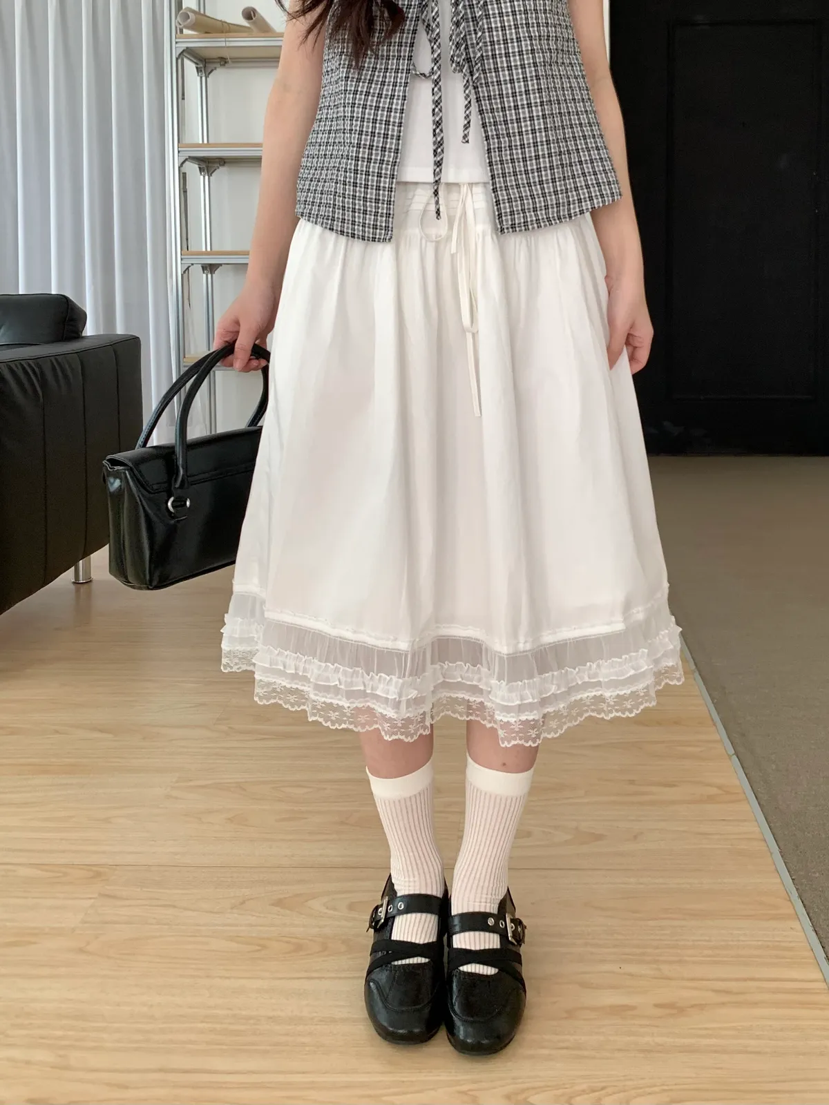 下擺是做拼接雪紡紗及蕾絲的材質設計,讓整件白裙更有仙氣的意境🧚♀️