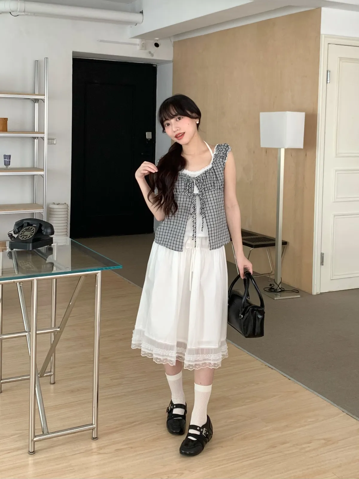 Apr.Sunny sweet泡泡格紋繞脖兩件式上衣(2colors)
