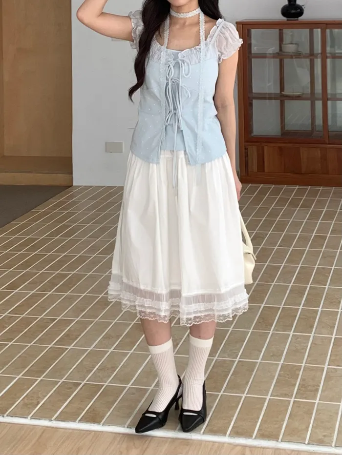Apr.Magnetic甜蜜吸引力波點綁帶假兩件上衣,附繞脖蕾絲(3colors)