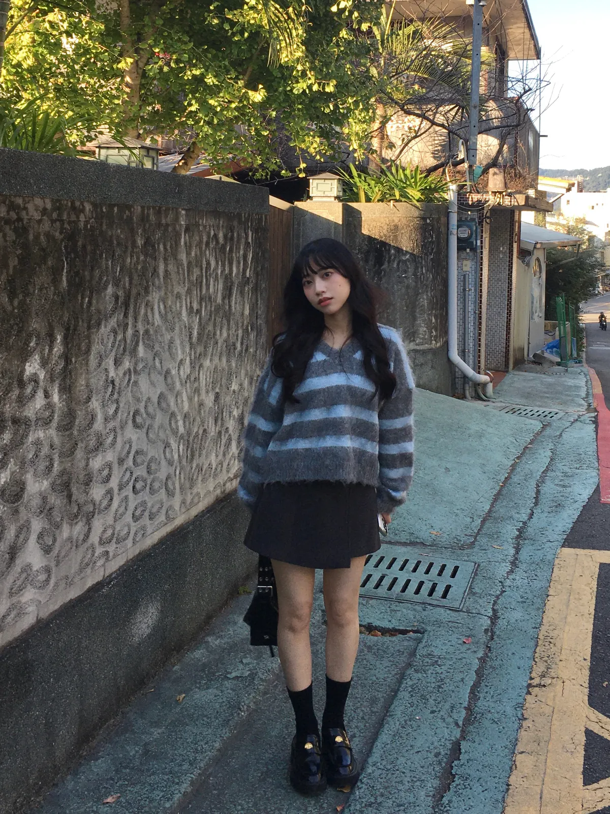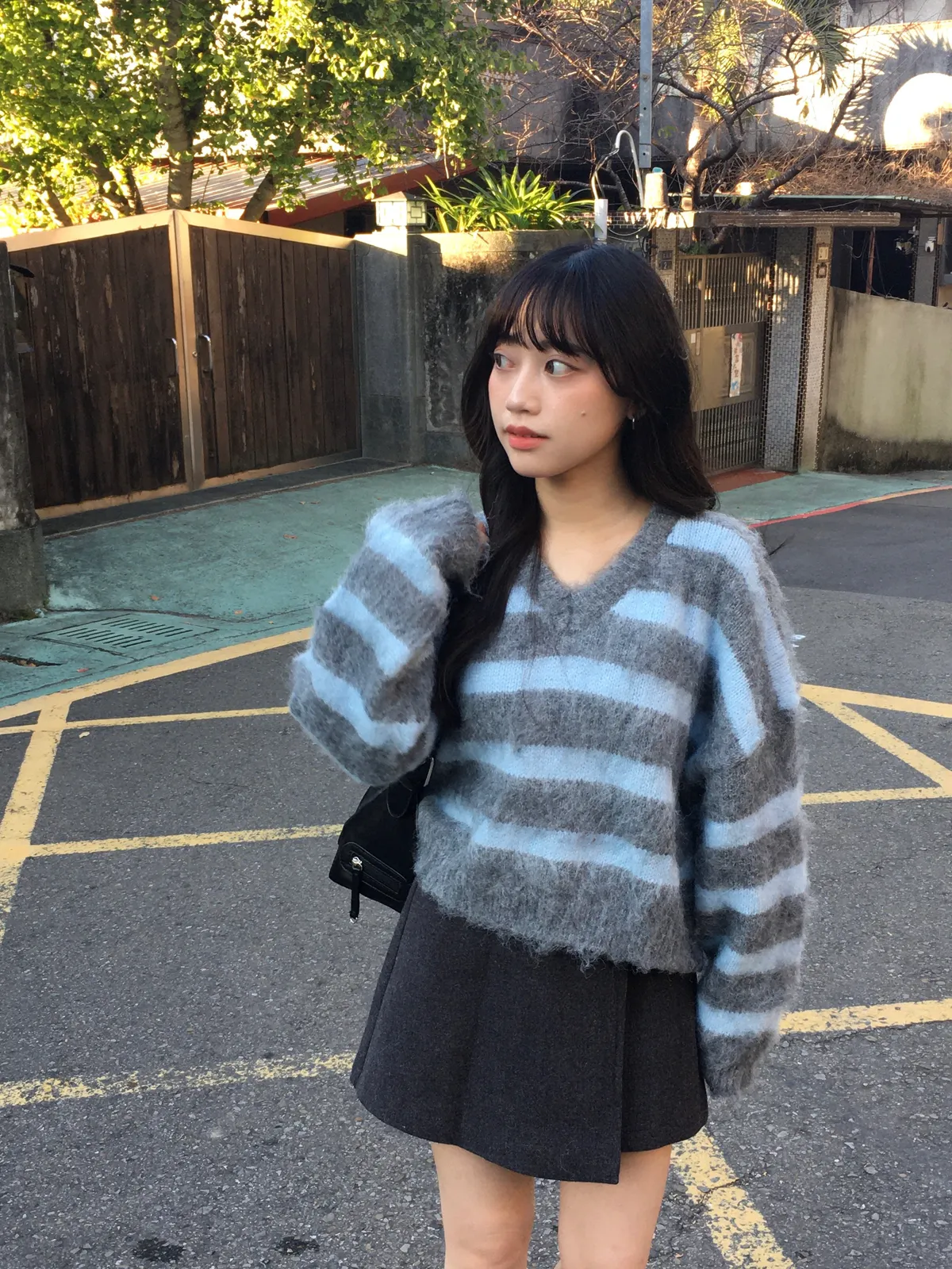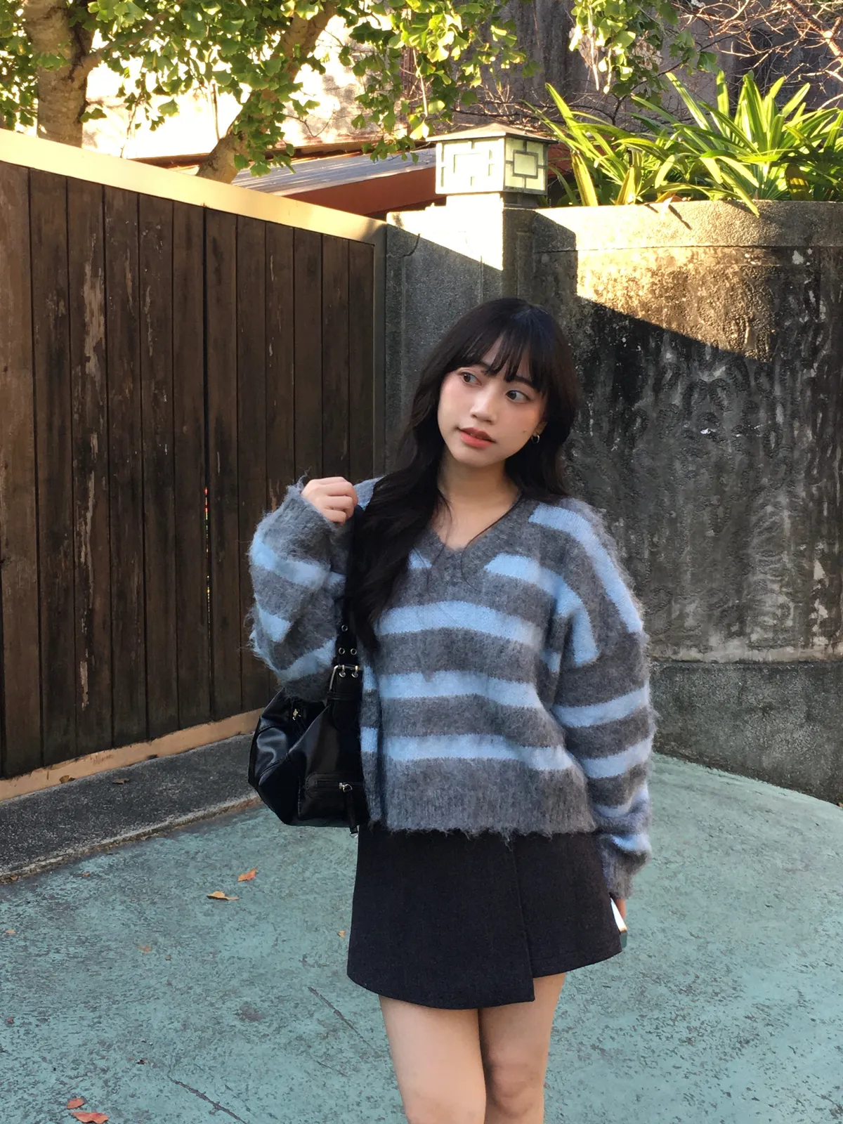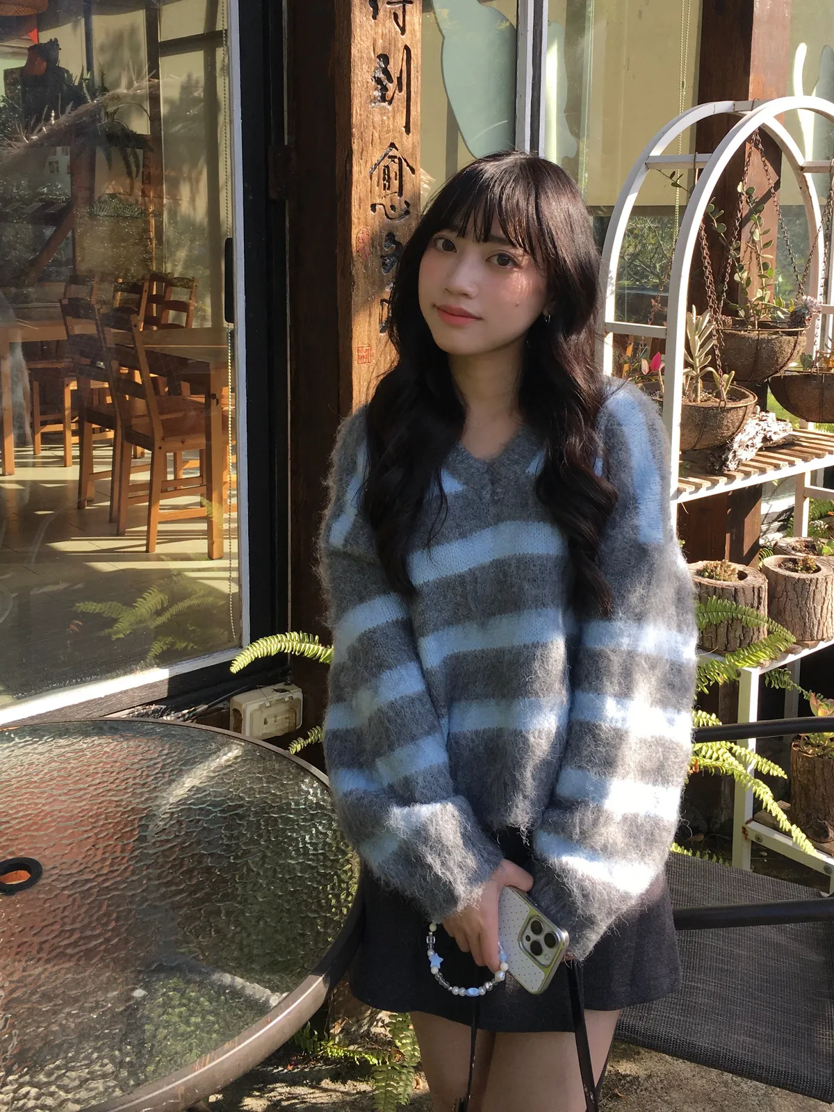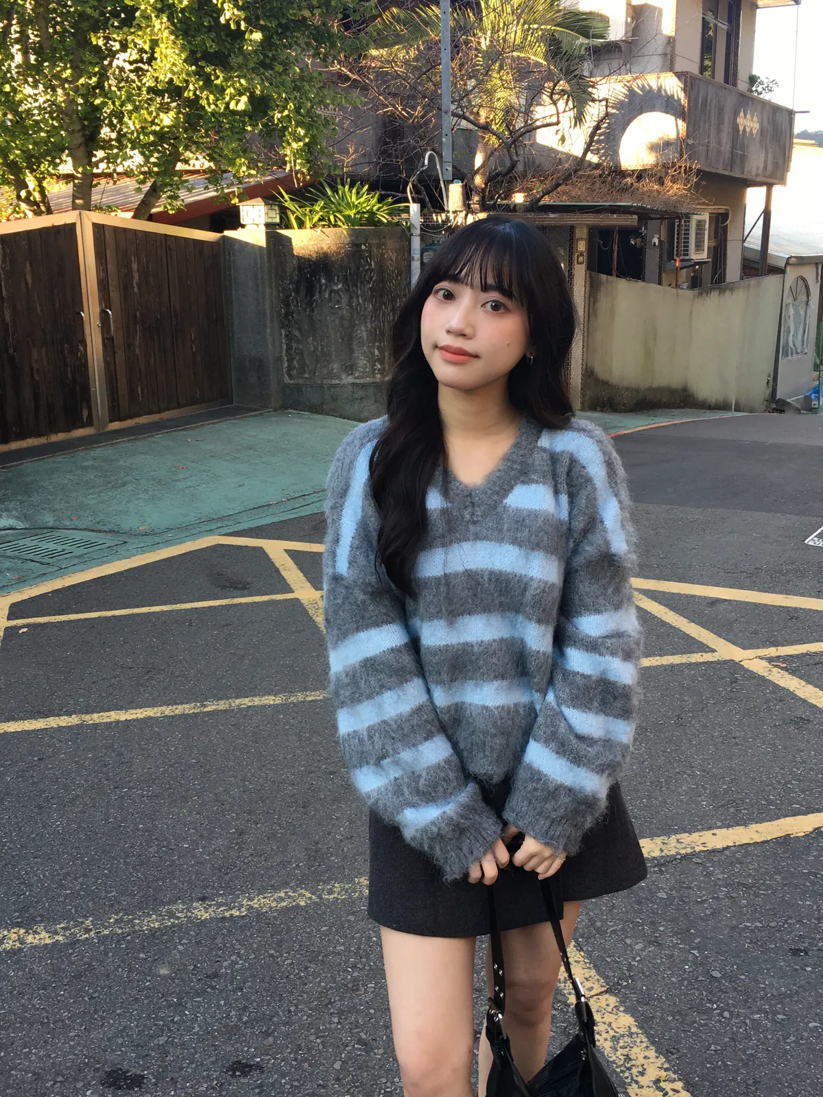 Dec.迷霧冷灰V領條紋毛衣(3colors)