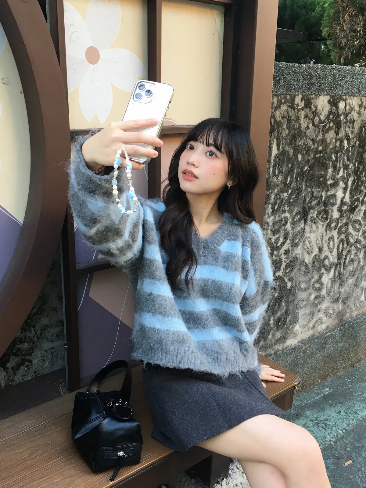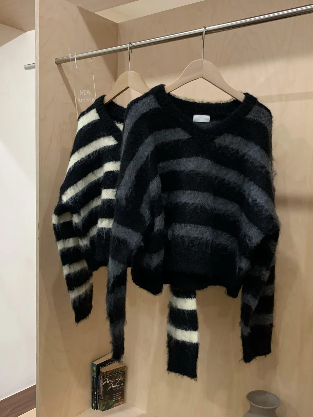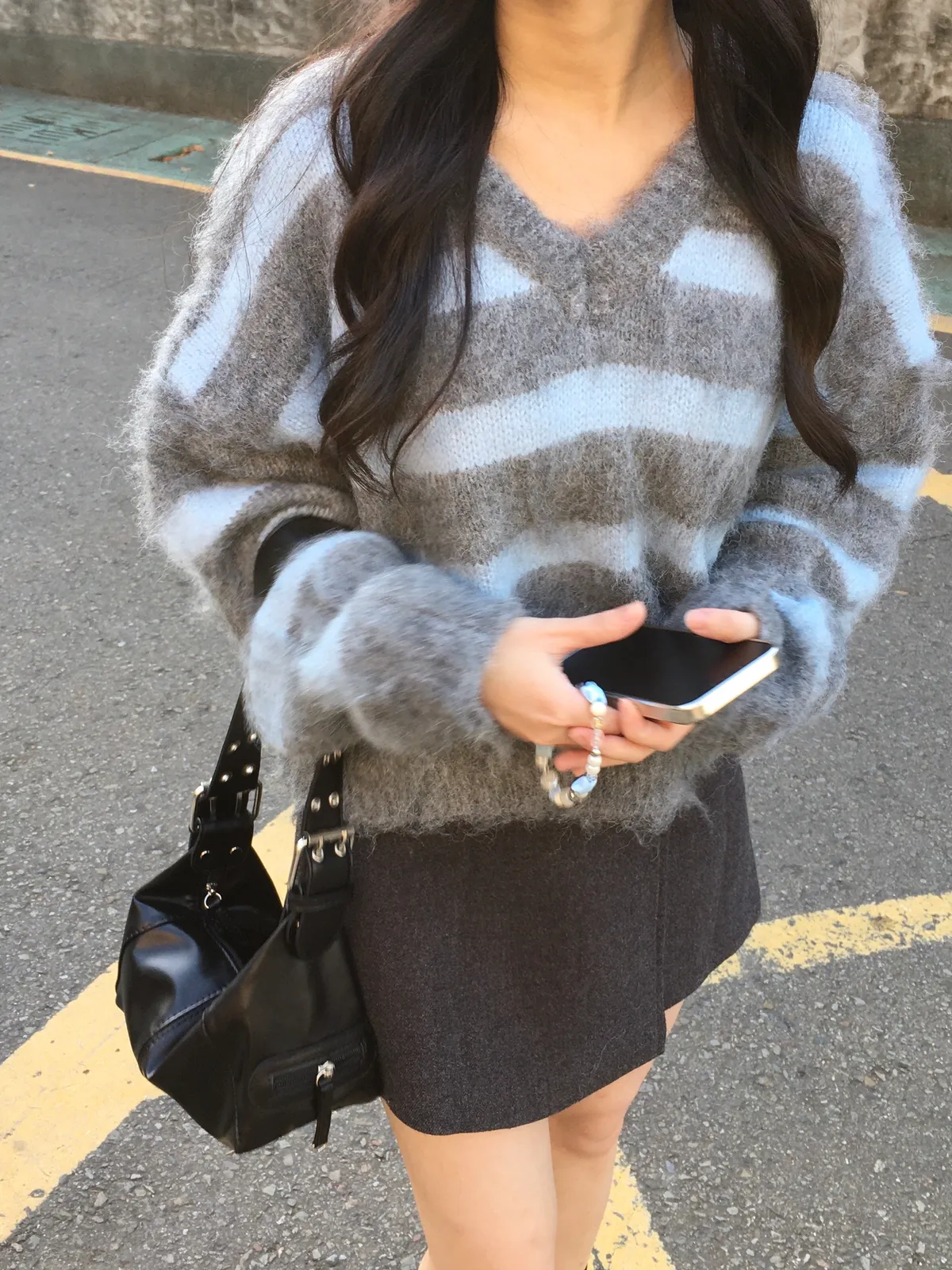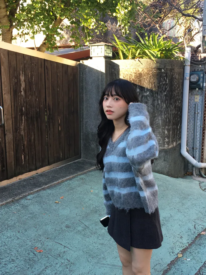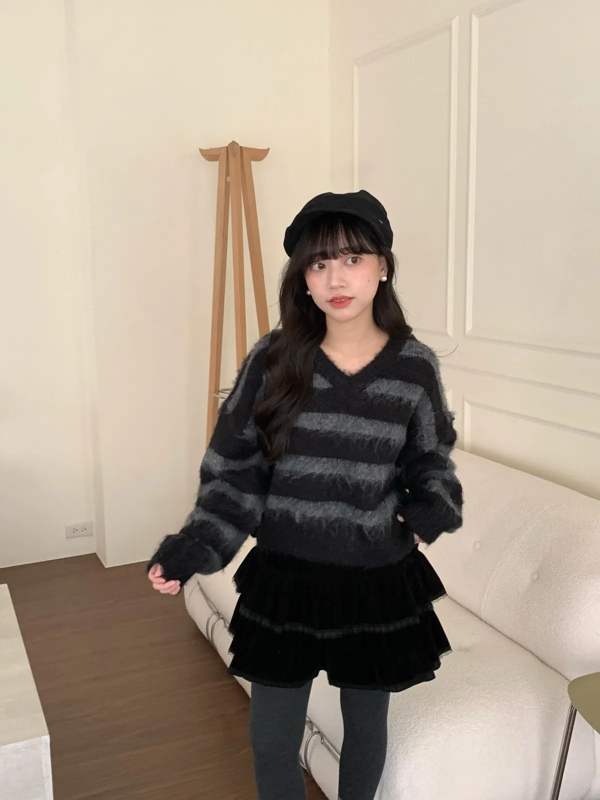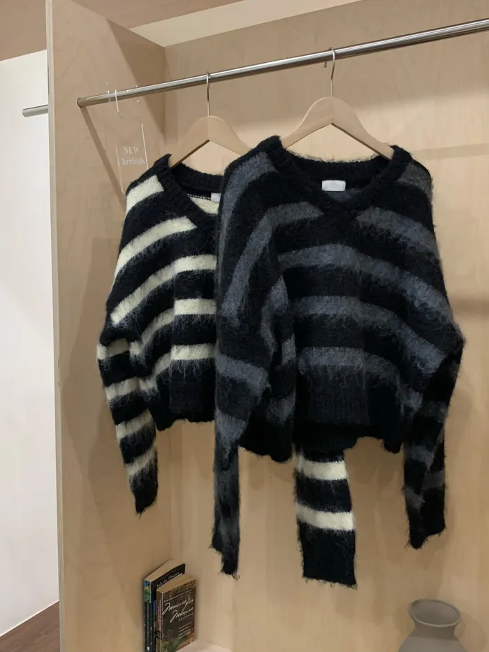 Dec.迷霧冷灰V領條紋毛衣(3colors)