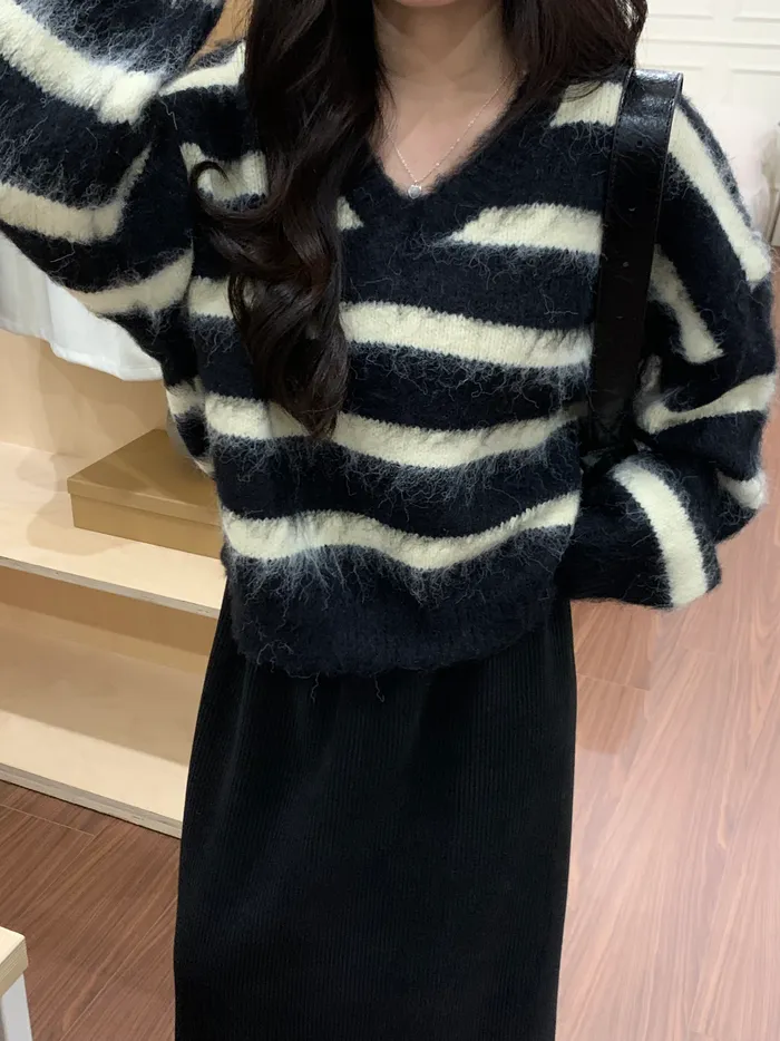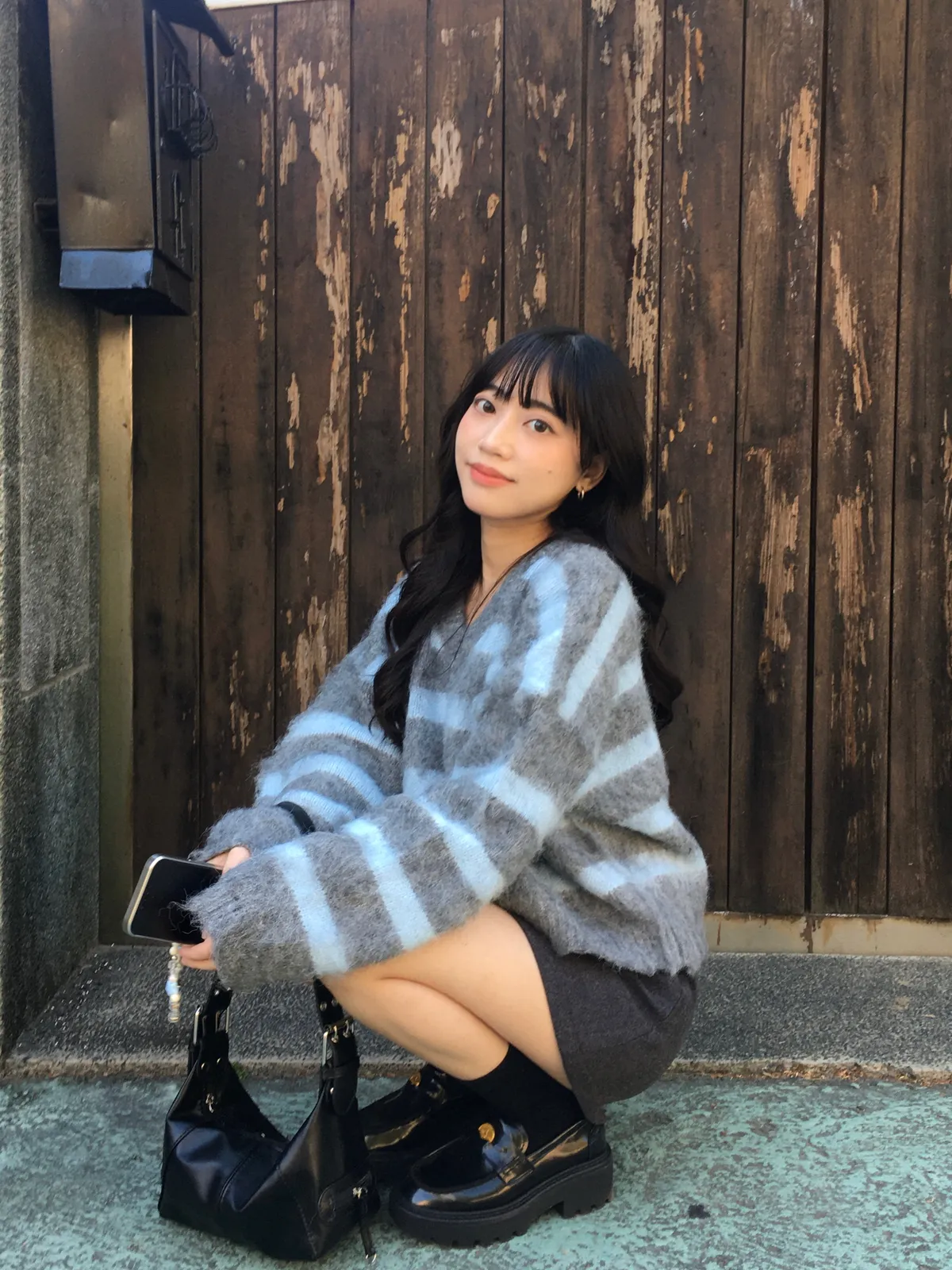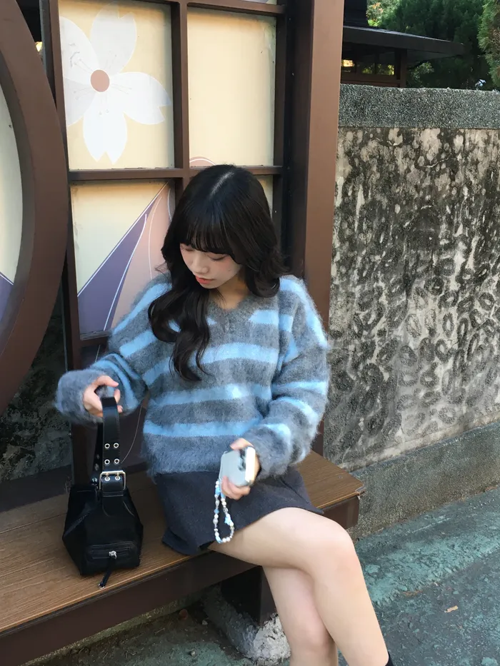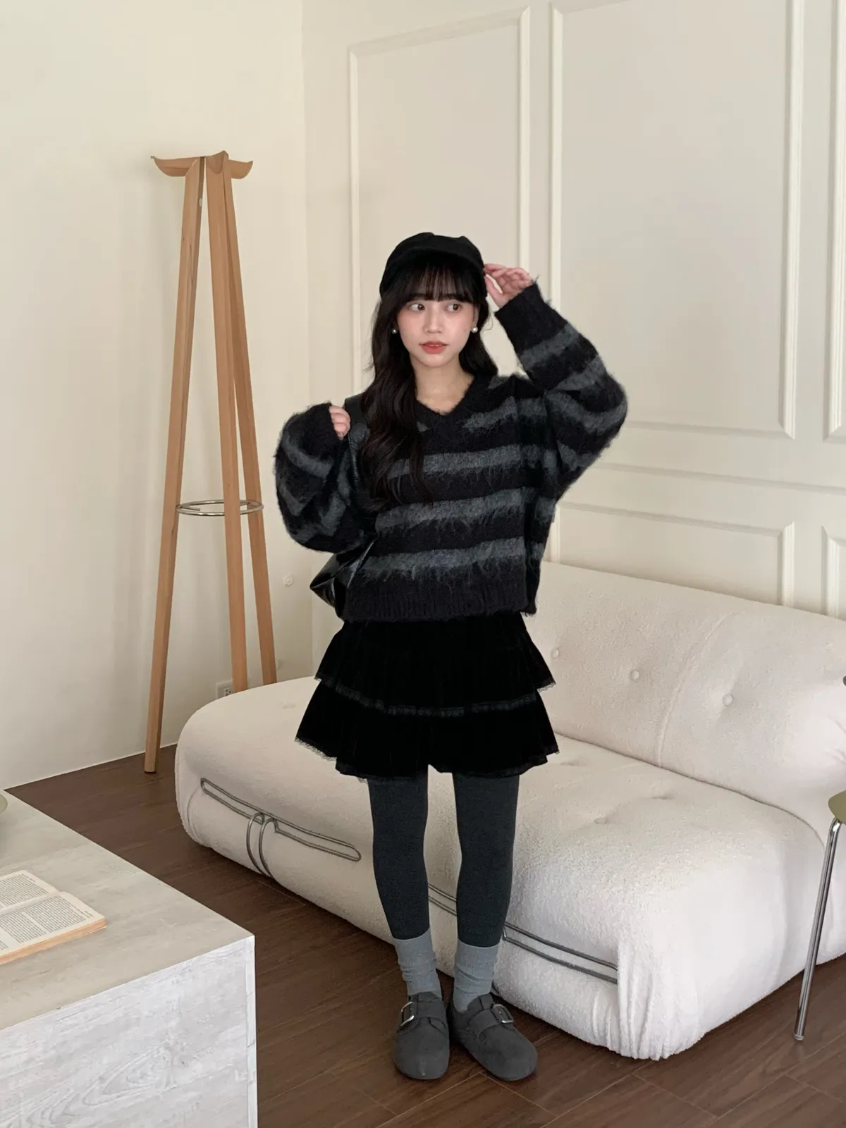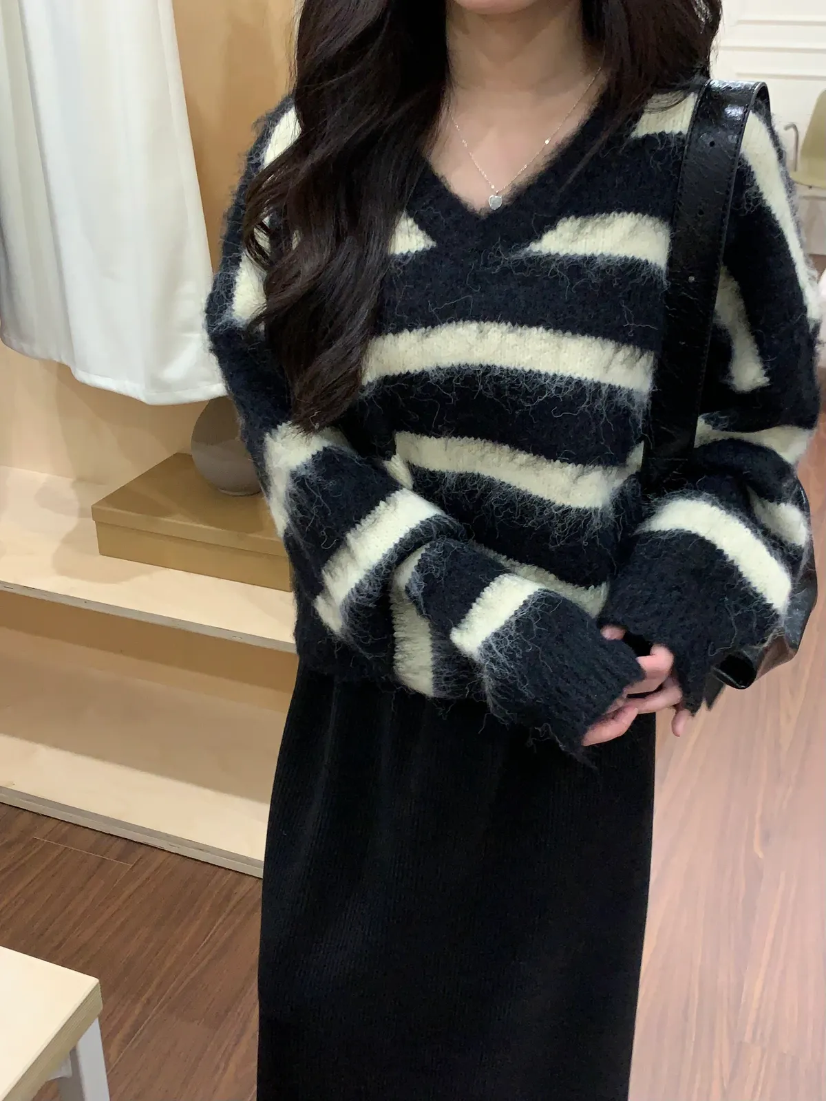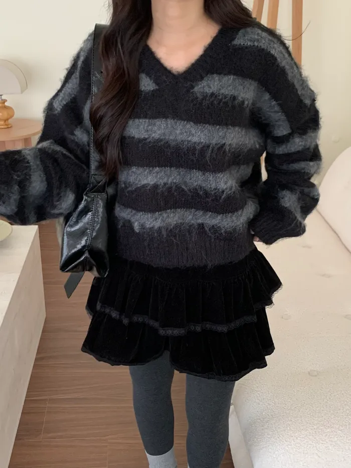Dec.迷霧冷灰V領條紋毛衣(3colors)