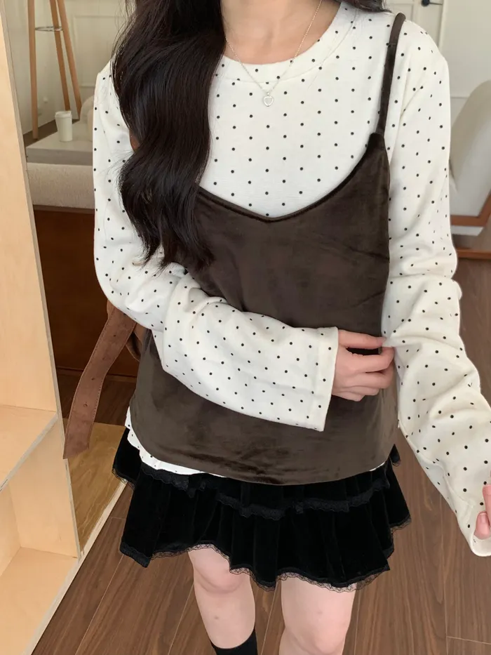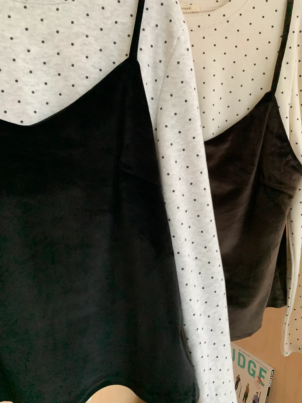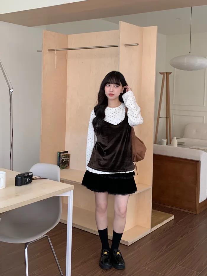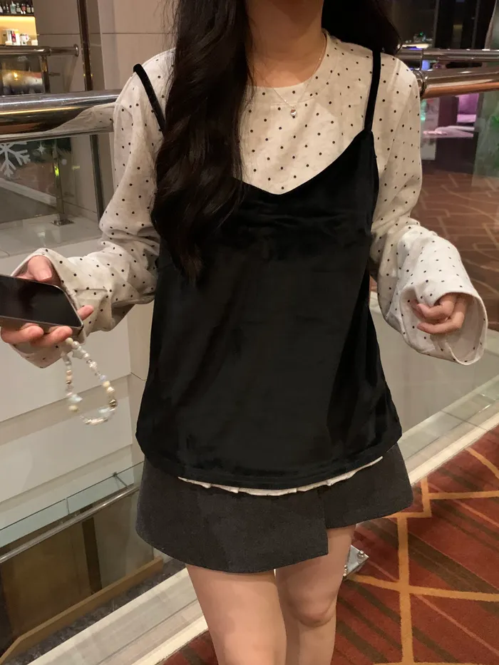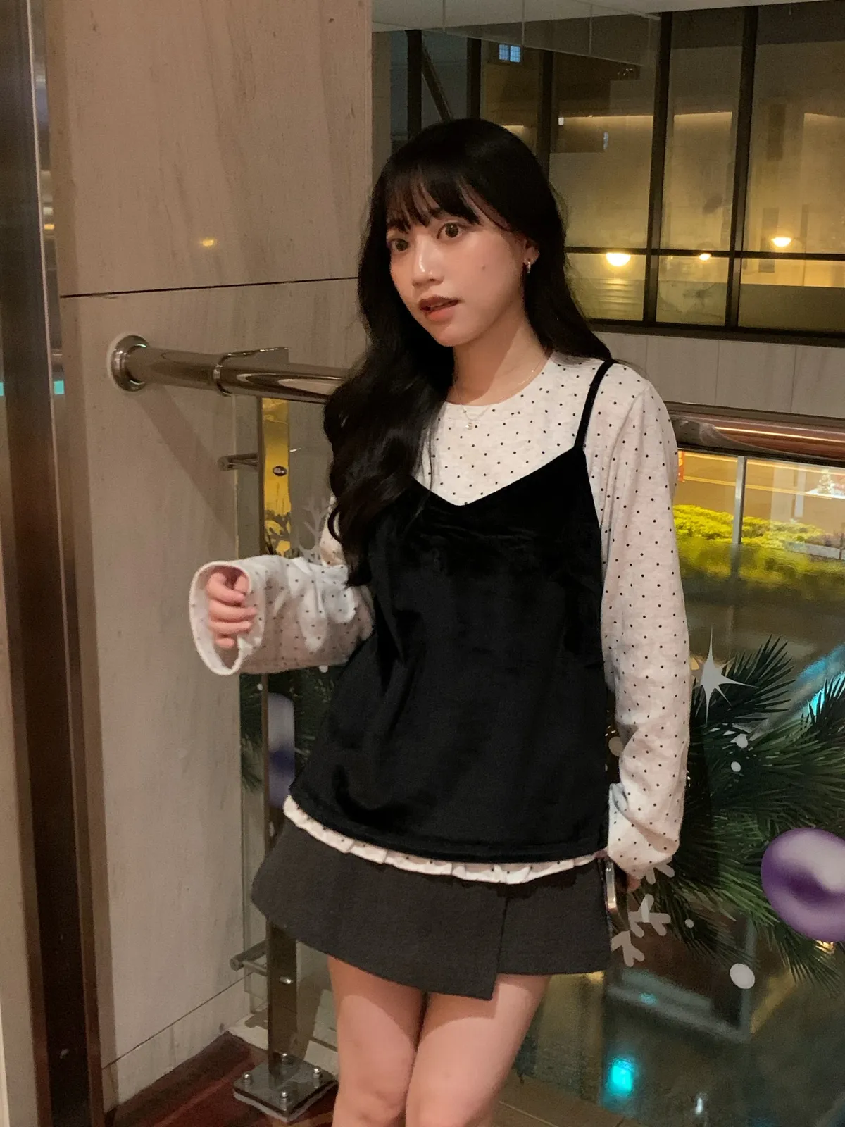 - 商品資訊 - 材質:絨面,布料有彈性背心肩帶不可調,彈性很大材質非常親膚是真兩件套唷!衣服也是磨毛絨面的 厚薄度也很適中!衣服下襬還有做木耳邊拼接小造型的疊穿層次感🖤Model/150/38 Detail