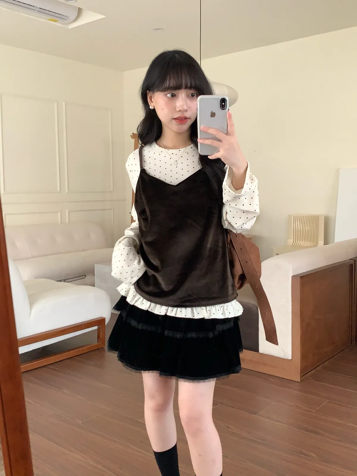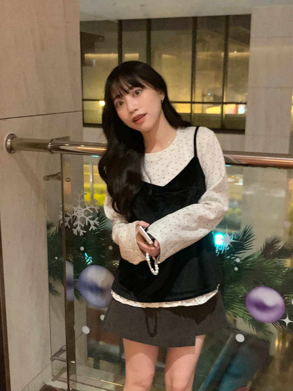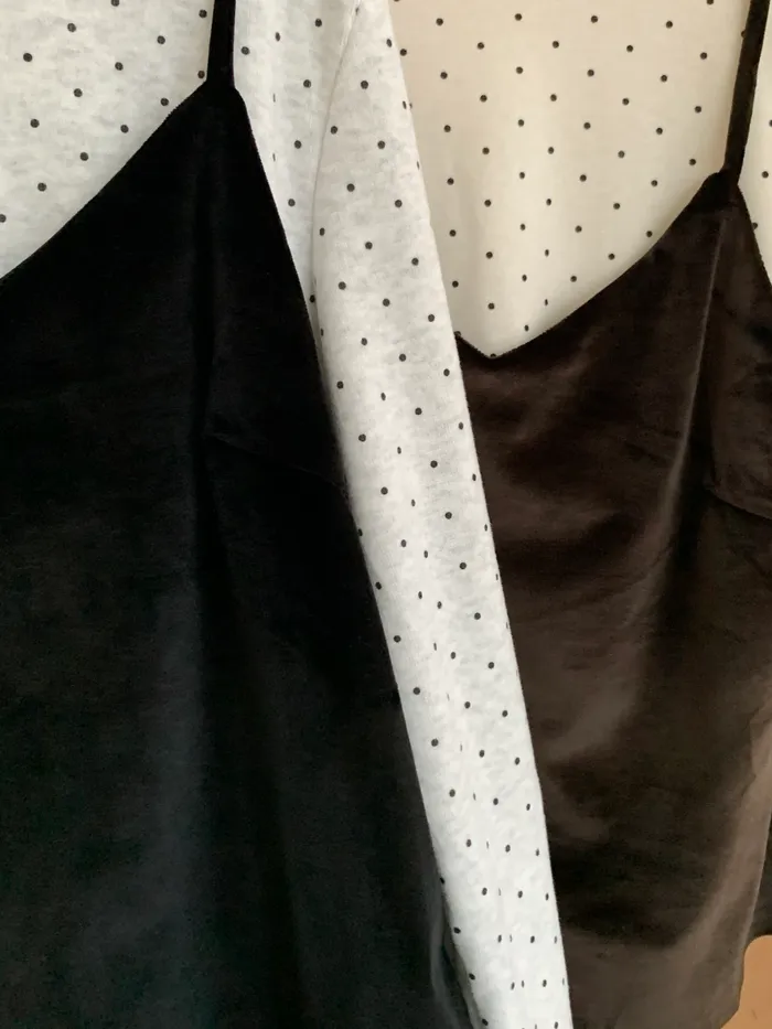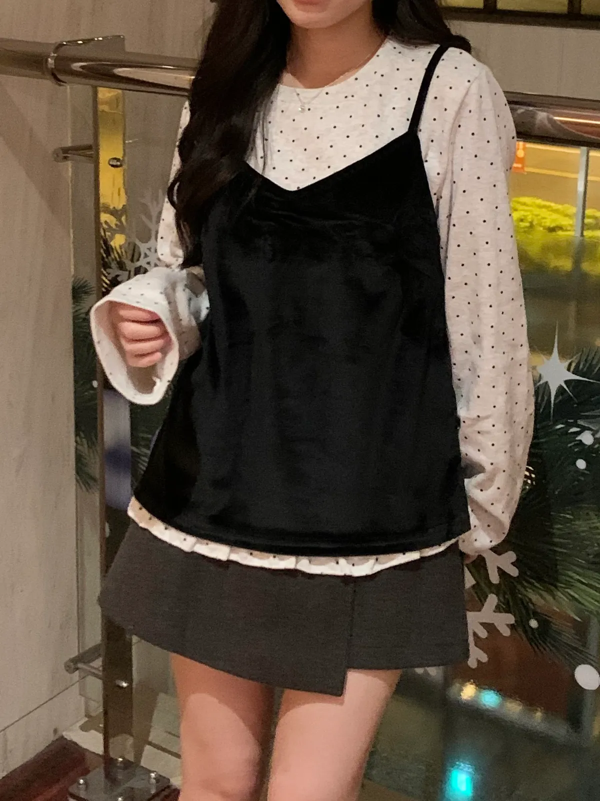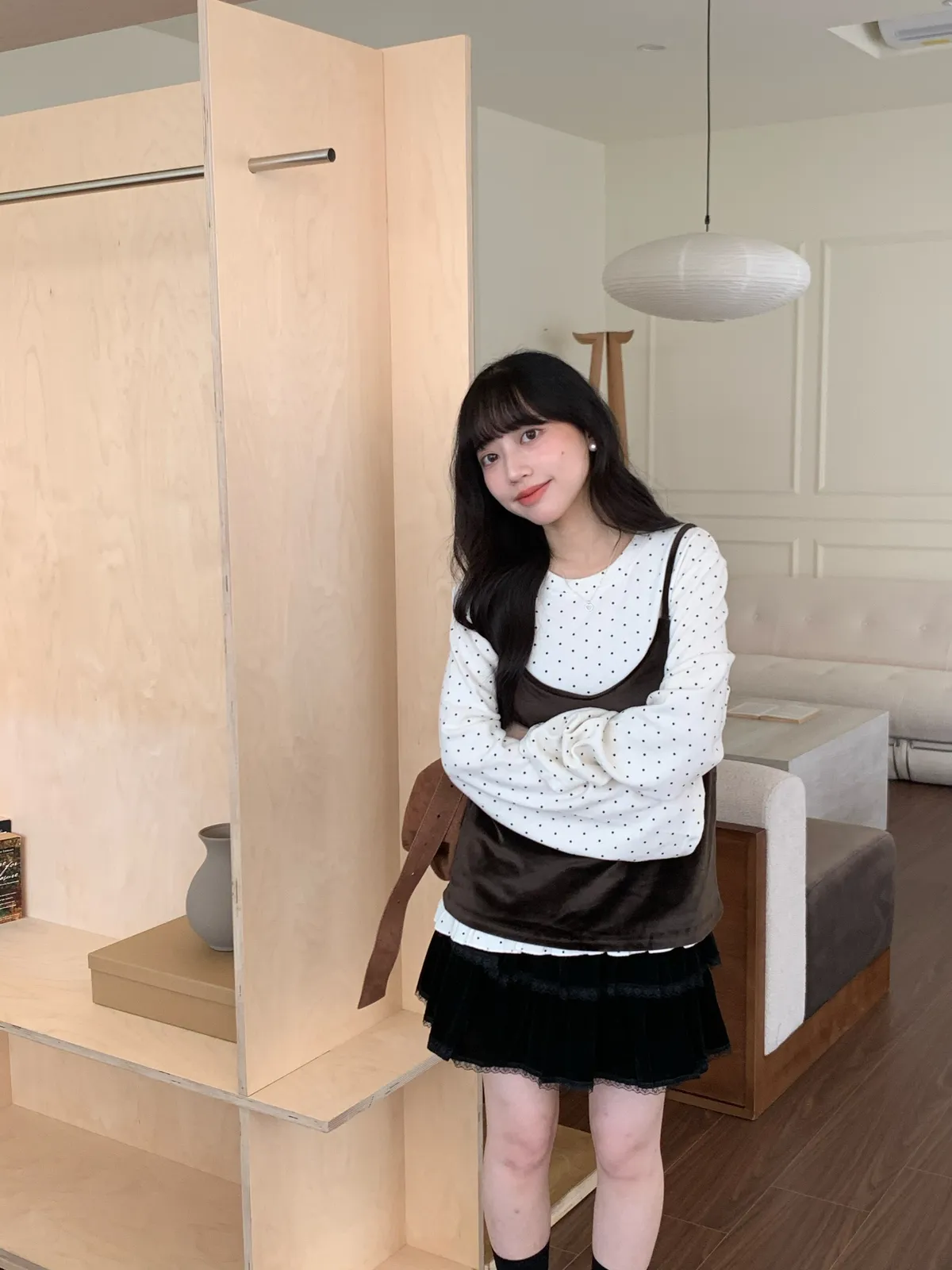 - 商品資訊 - 材質:絨面,布料有彈性背心肩帶不可調,彈性很大材質非常親膚是真兩件套唷!衣服也是磨毛絨面的 厚薄度也很適中!衣服下襬還有做木耳邊拼接小造型的疊穿層次感🖤Model/150/38 Detail