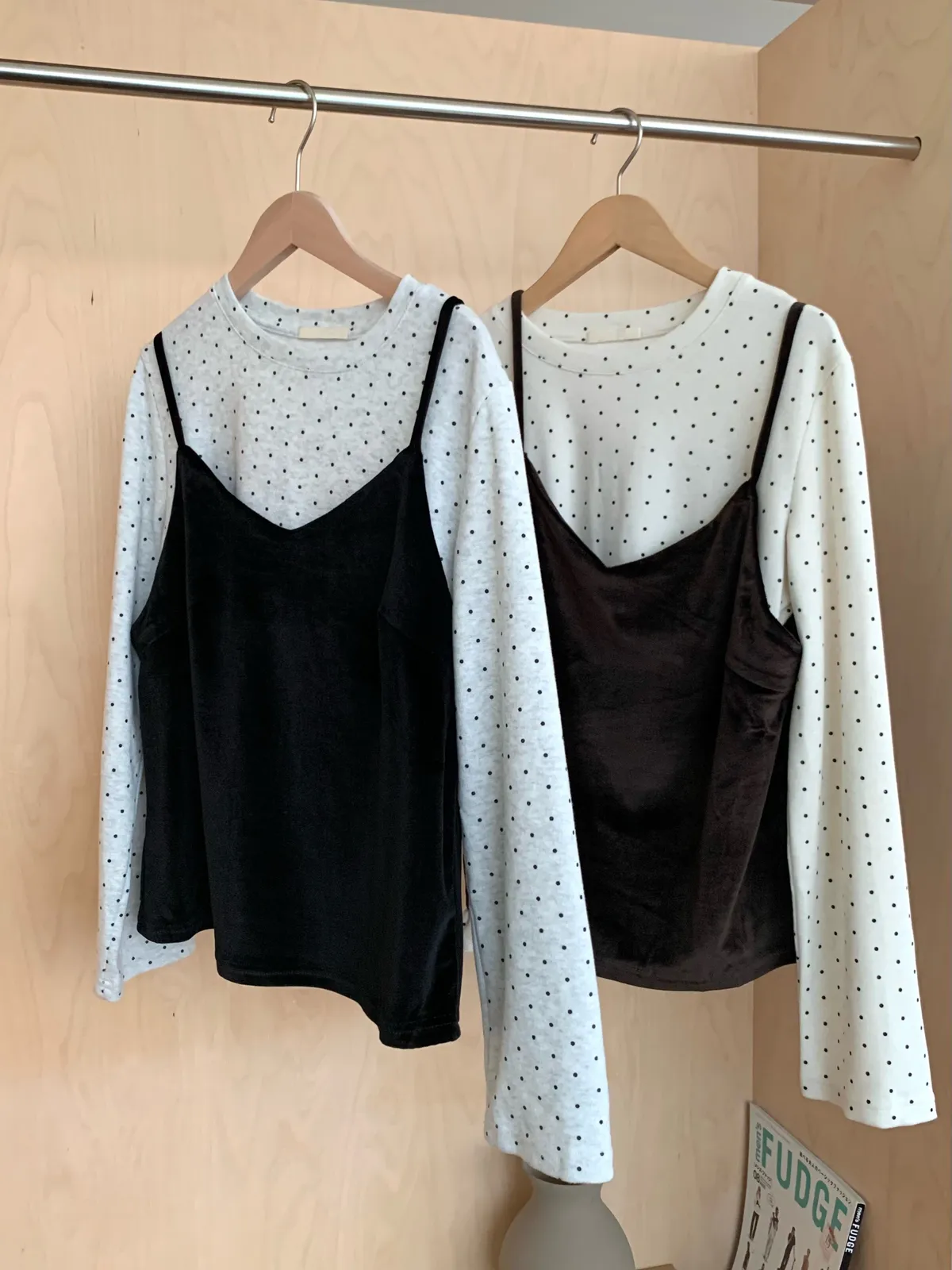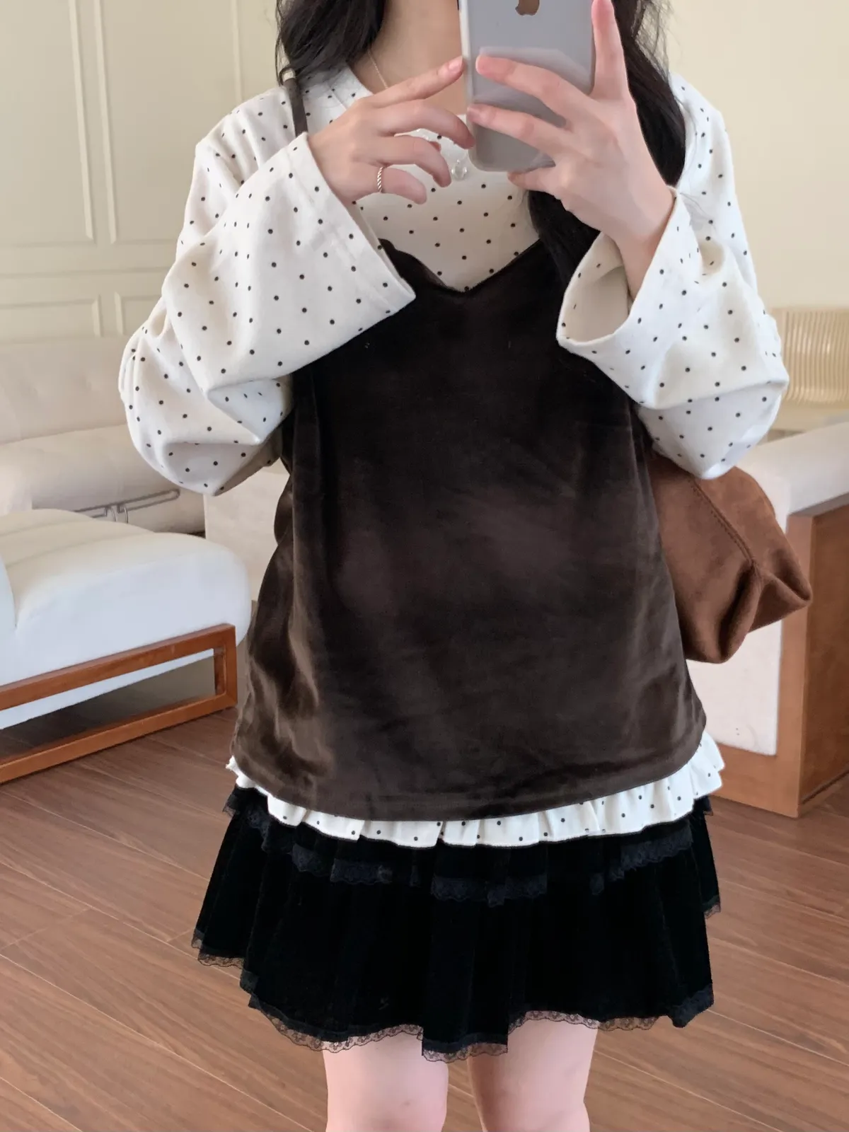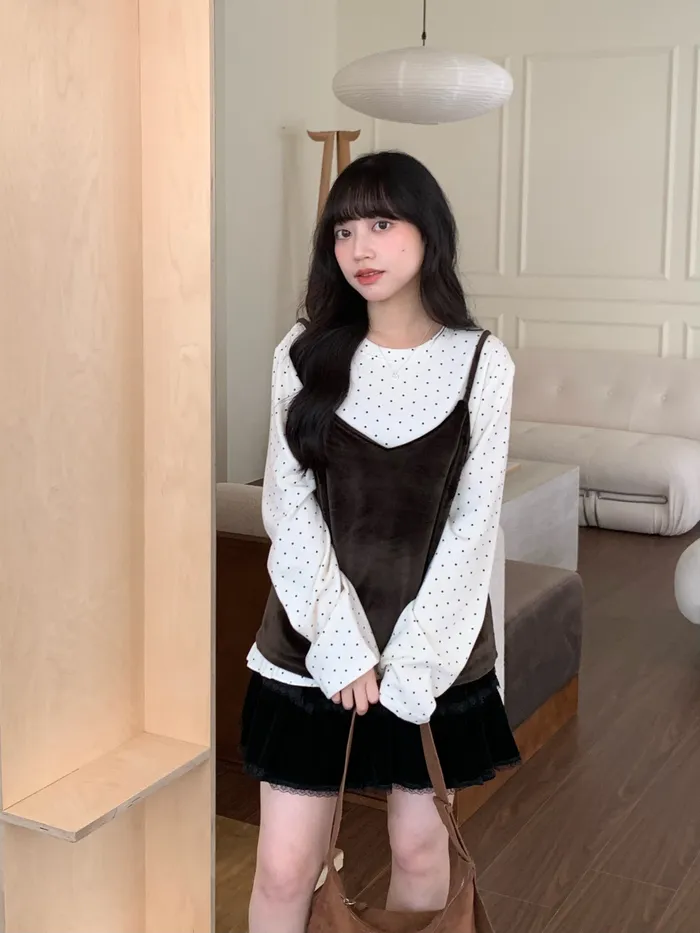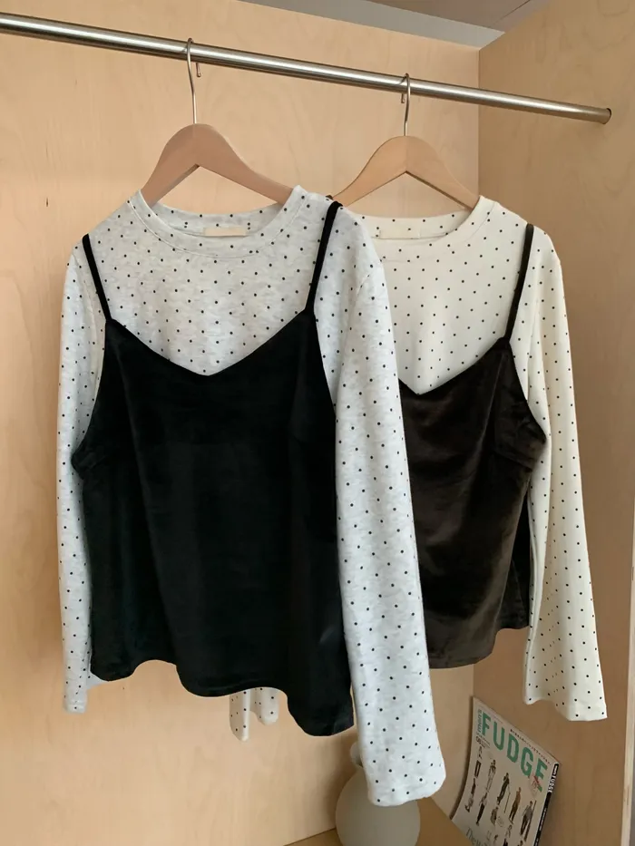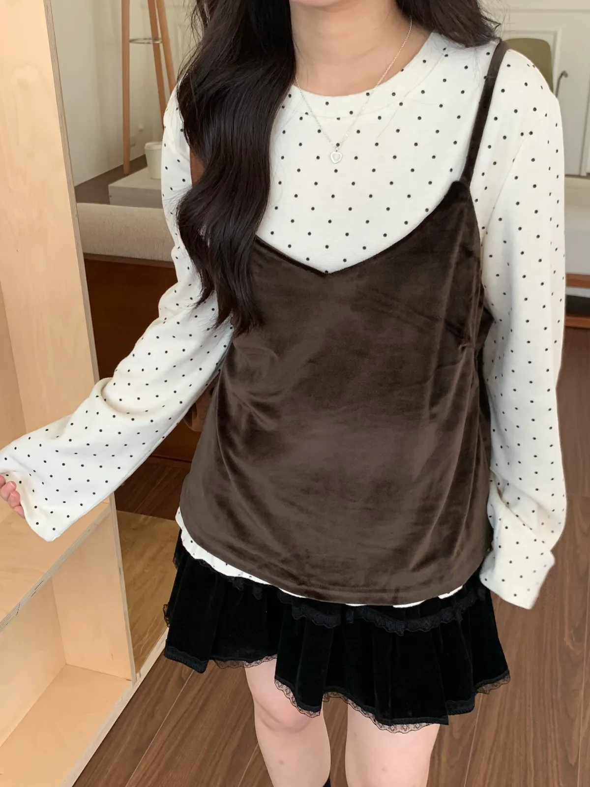 - 商品資訊 - 材質:絨面,布料有彈性背心肩帶不可調,彈性很大材質非常親膚是真兩件套唷!衣服也是磨毛絨面的 厚薄度也很適中!衣服下襬還有做木耳邊拼接小造型的疊穿層次感🖤Model/150/38 Detail