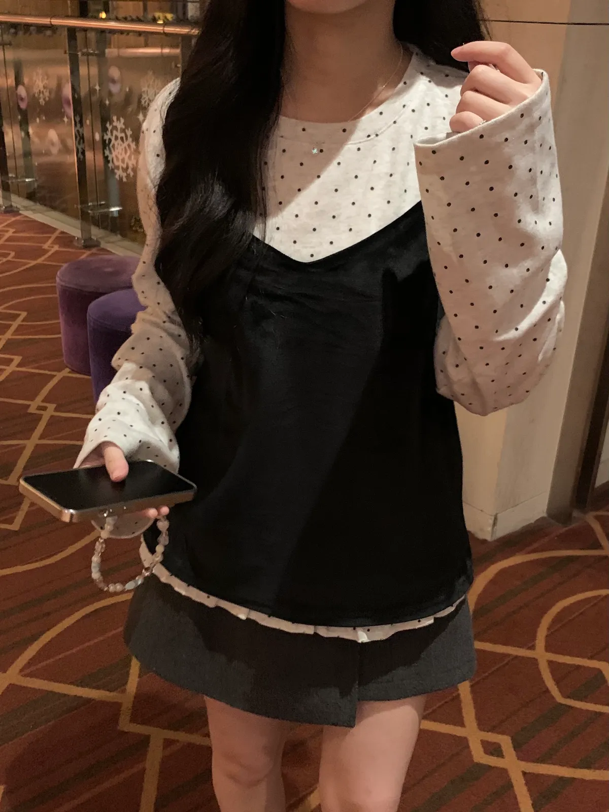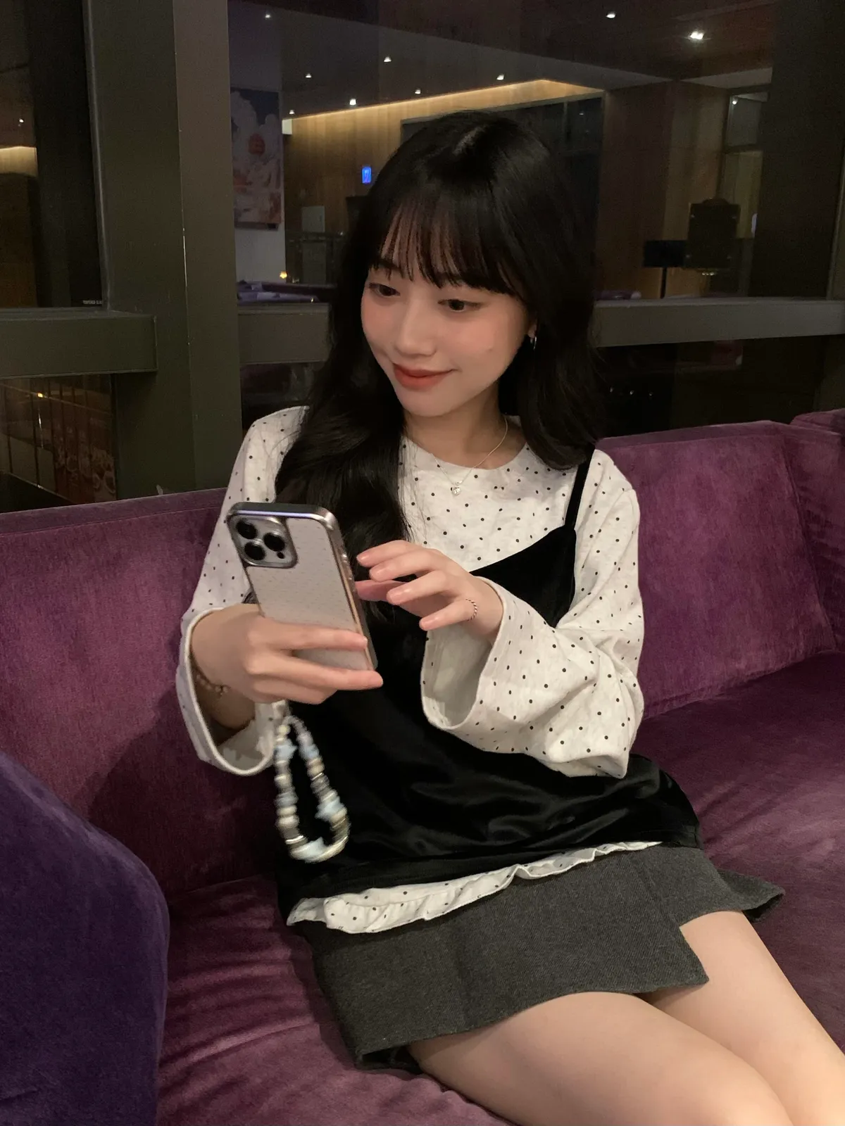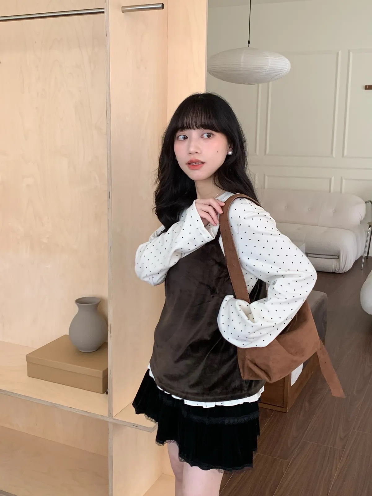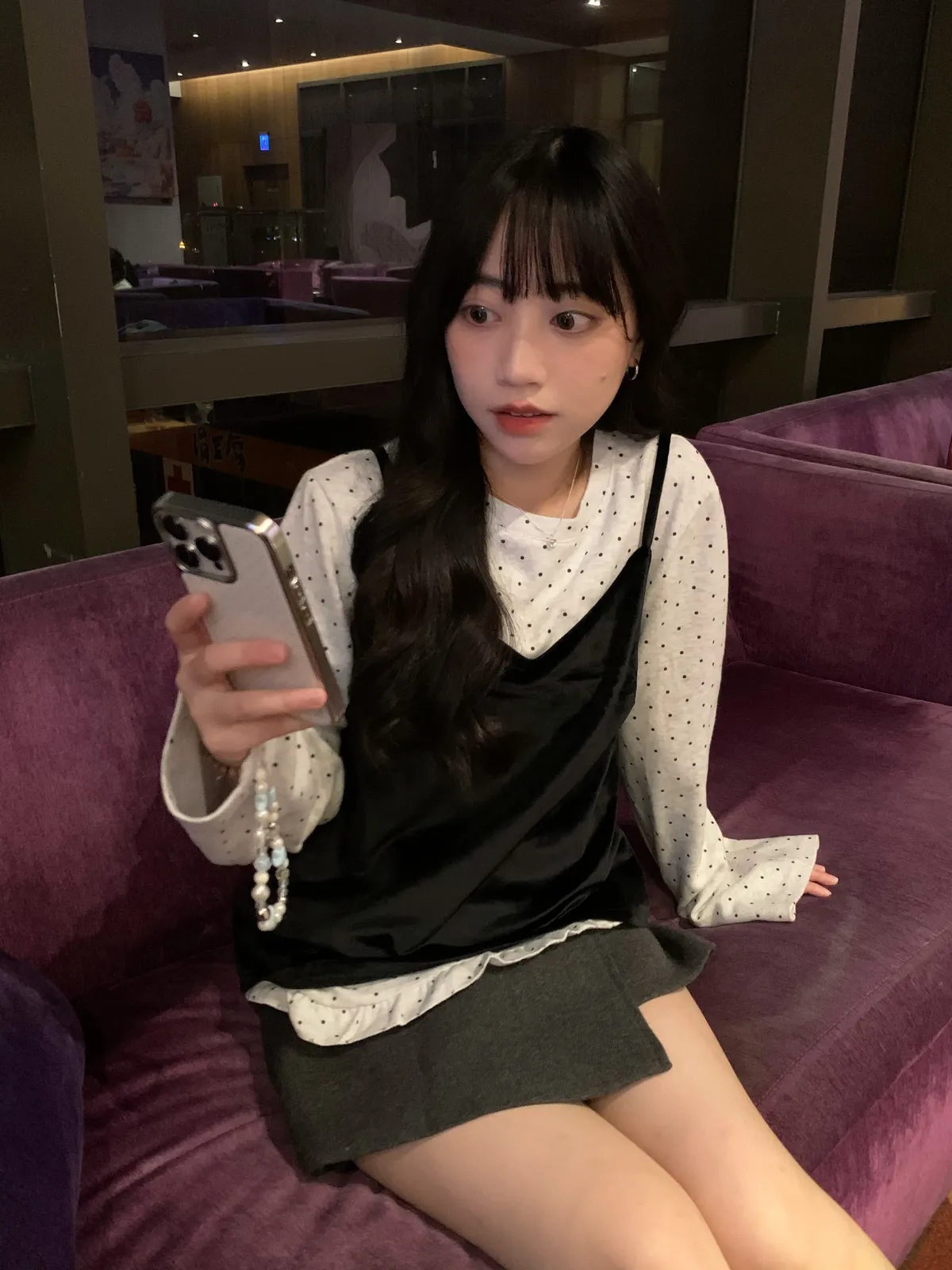 - 商品資訊 - 材質:絨面,布料有彈性背心肩帶不可調,彈性很大材質非常親膚是真兩件套唷!衣服也是磨毛絨面的 厚薄度也很適中!衣服下襬還有做木耳邊拼接小造型的疊穿層次感🖤Model/150/38 Detail