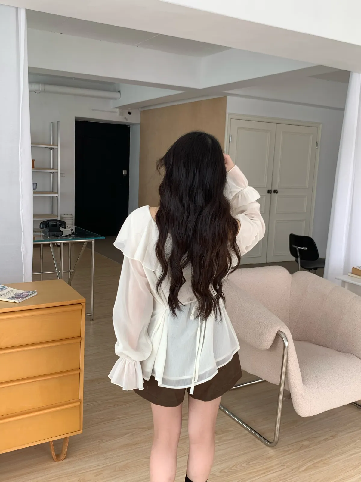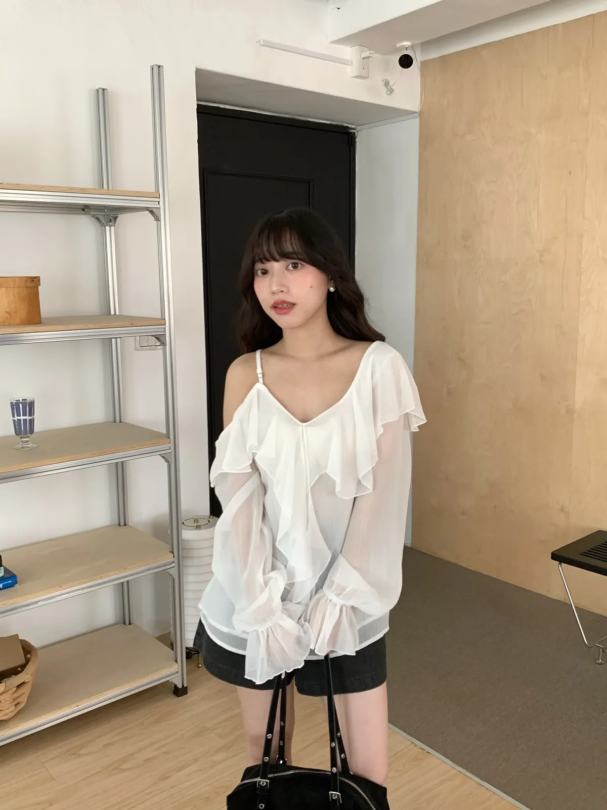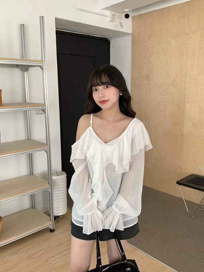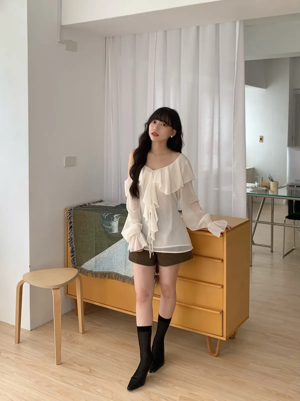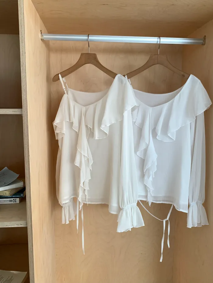 Apr.許願池少女荷葉領斜肩雪紡衫(2colors),現貨