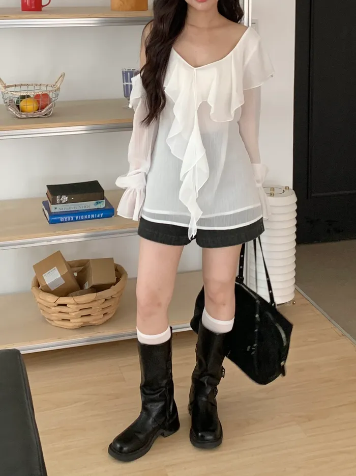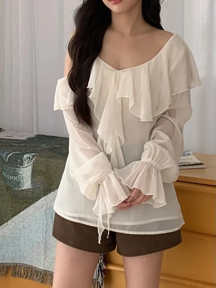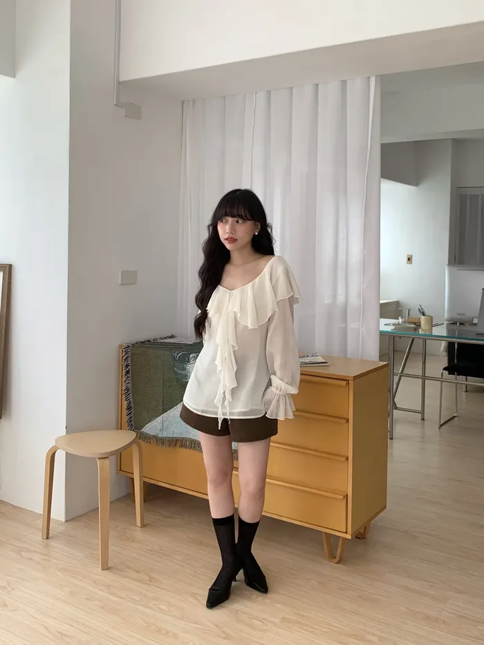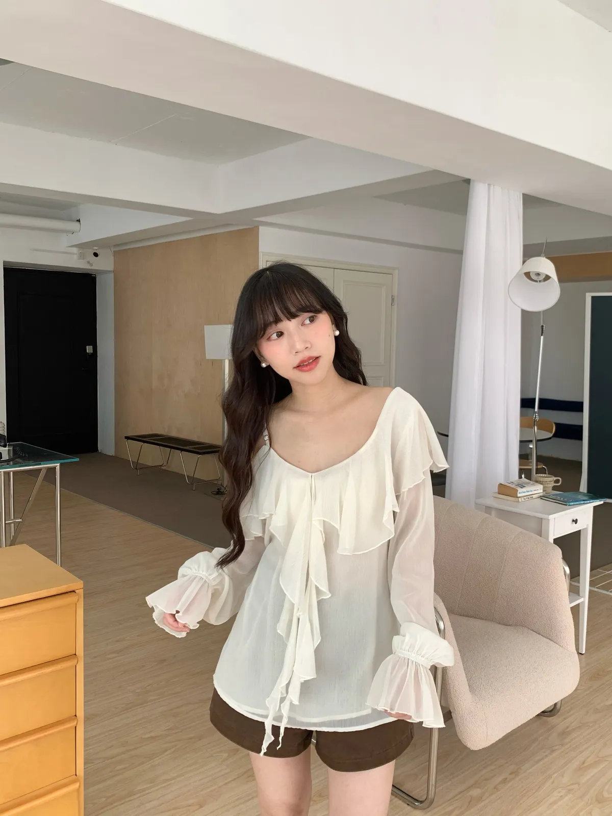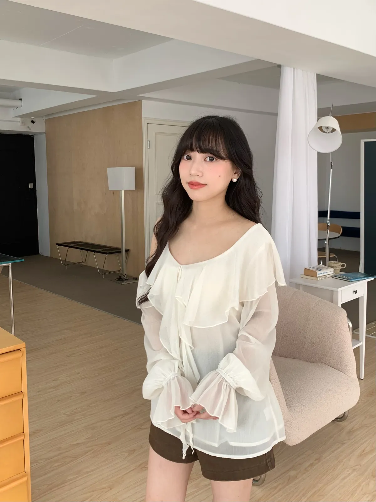 Apr.許願池少女荷葉領斜肩雪紡衫(2colors),現貨