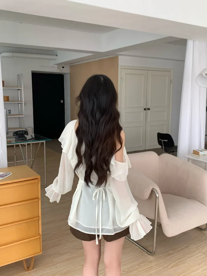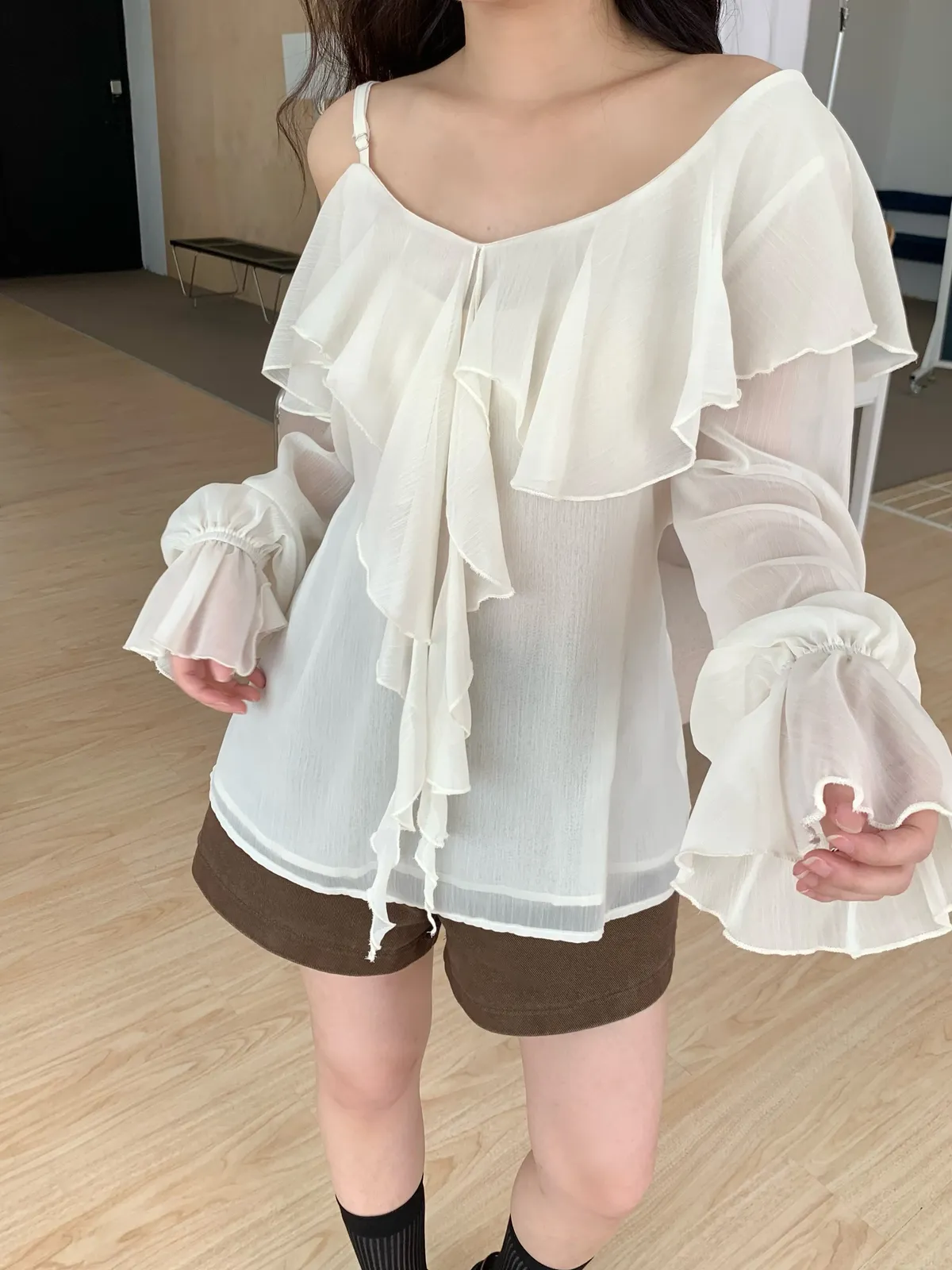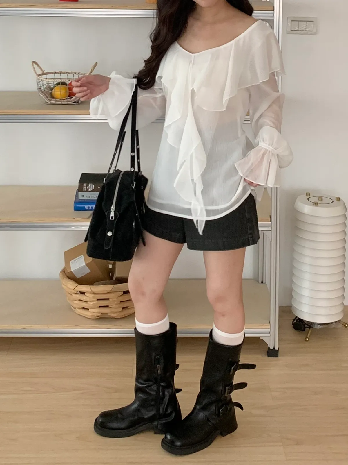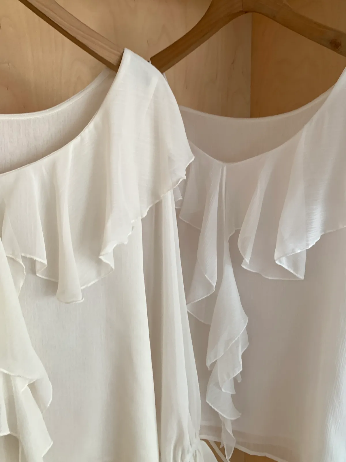 Apr.許願池少女荷葉領斜肩雪紡衫(2colors),現貨